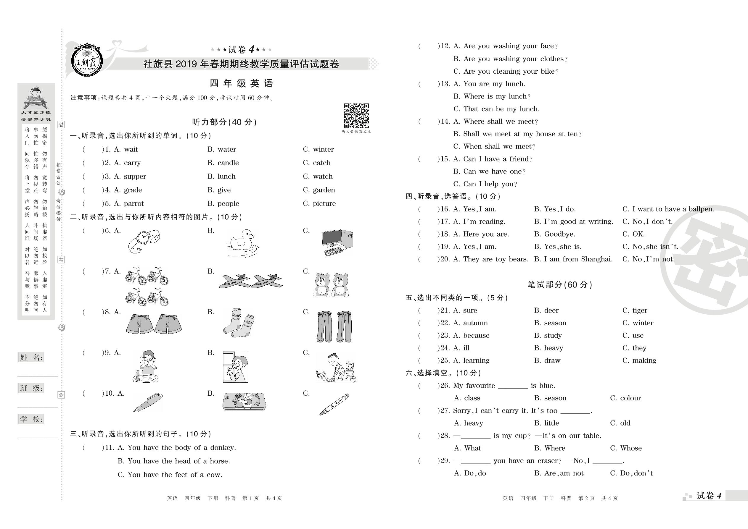 2018-2019学年第二学期南阳市社旗县四年级英语试卷(科普版)【4】