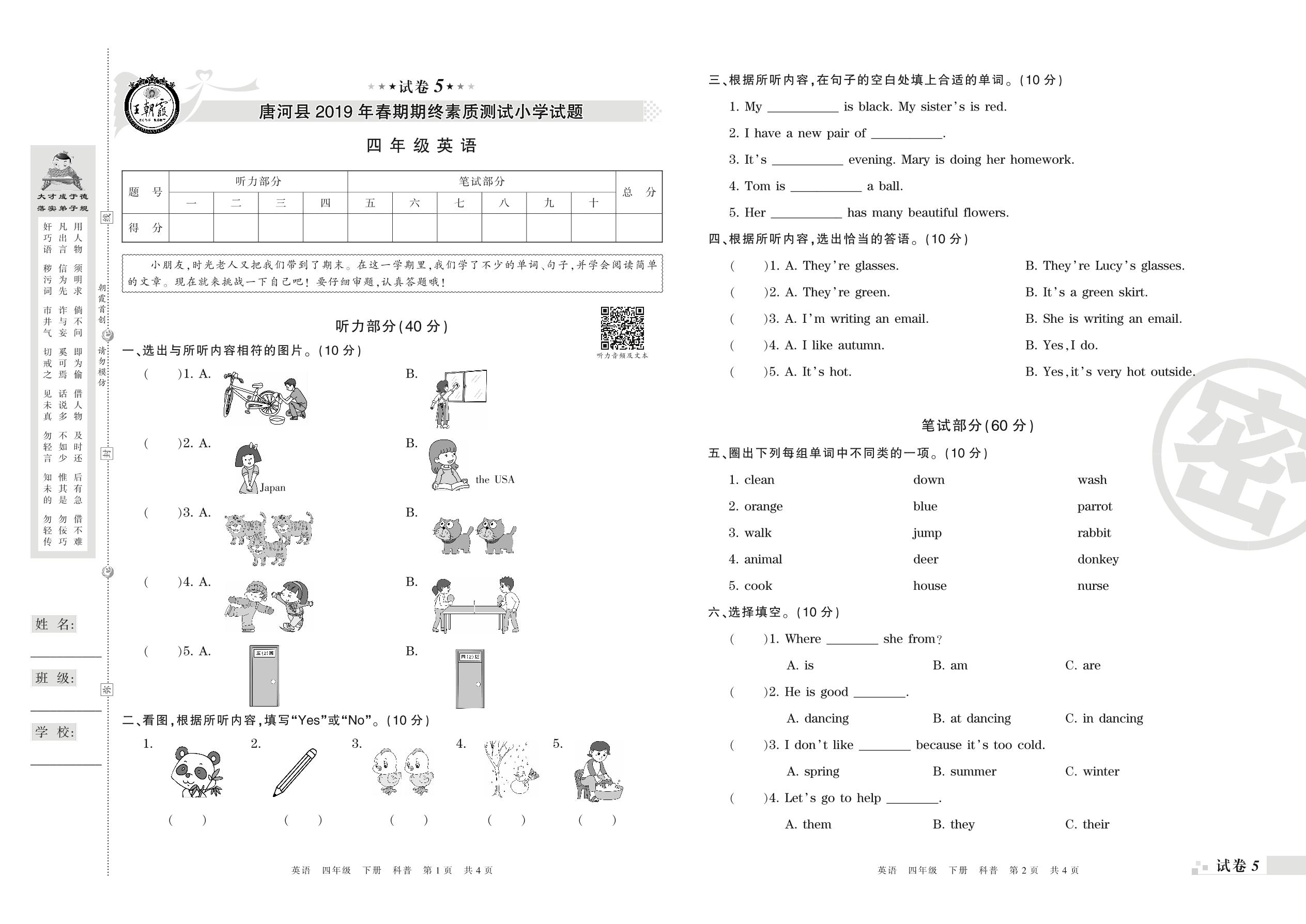 2018-2019学年第二学期南阳市唐河县四年级英语试卷(科普版)【5】