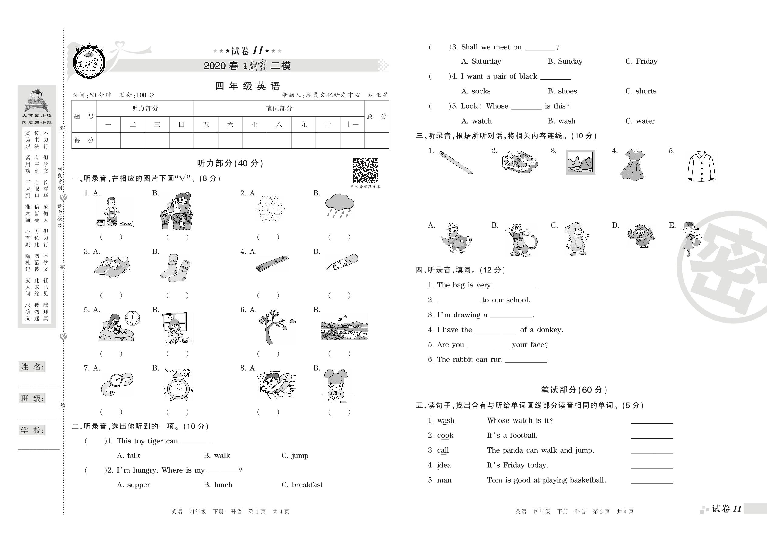 王朝霞期末模拟卷四年级下册英语(科普版)_R21080792803【11】