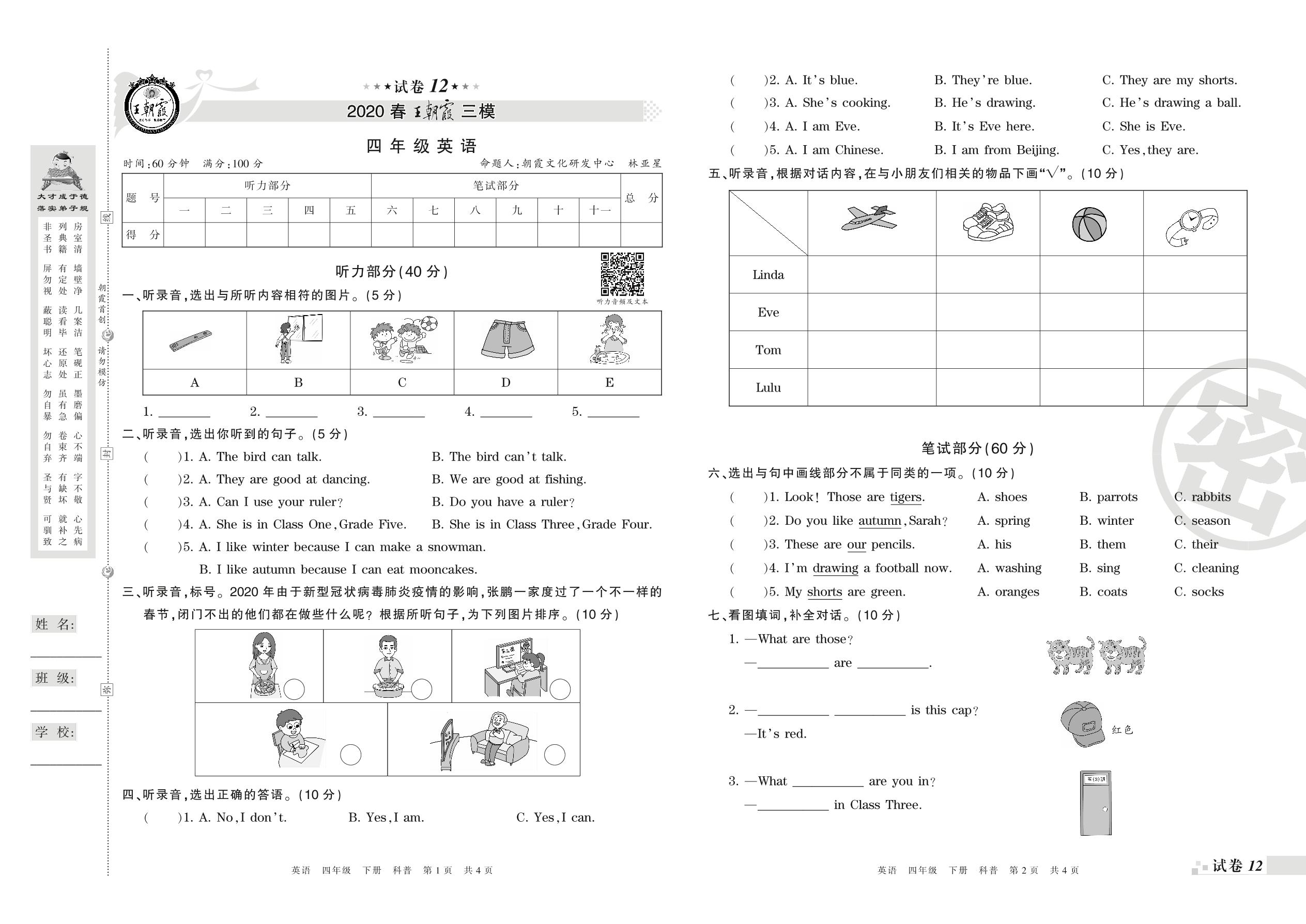 王朝霞期末模拟卷四年级下册英语(科普版)_R21080792811【12】