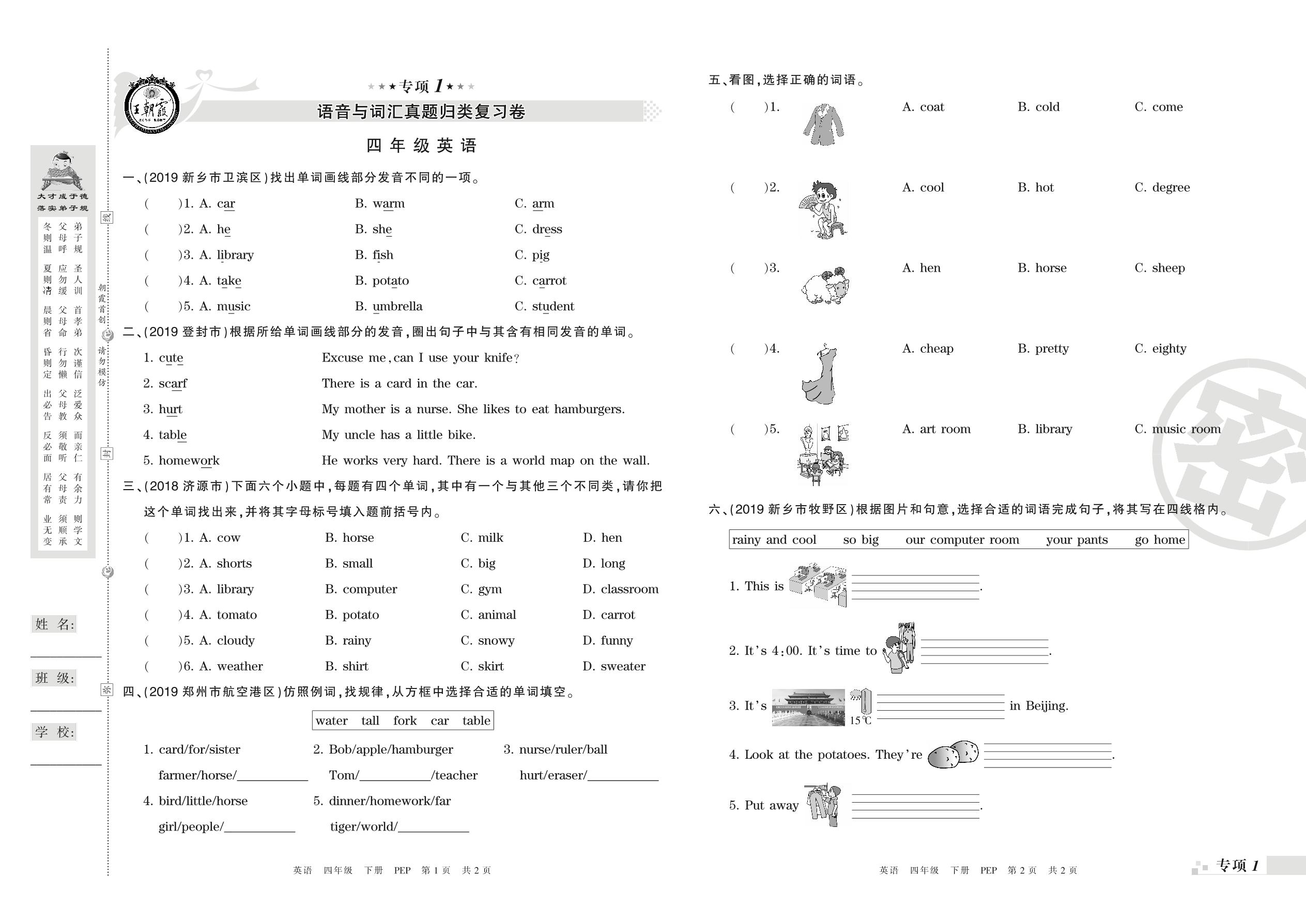 王朝霞期末专项卷——语音与词汇、句子(一)真题归类复习卷四年级下册英语(PEP版)_R21080792822【0】