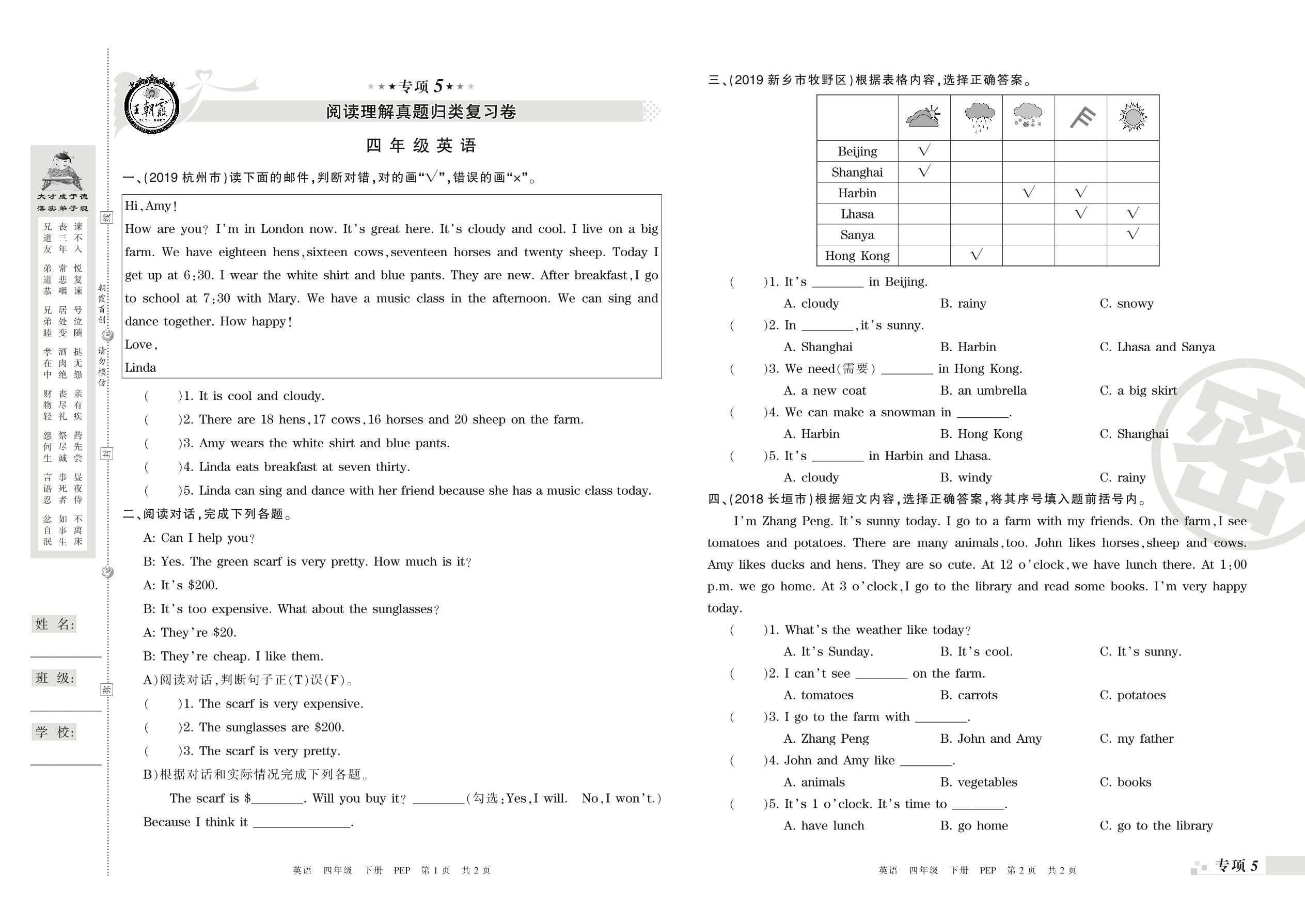 王朝霞期末专项卷——阅读理解真题归类复习卷、新颖题速递:绘本阅读四年级下册英语(PEP版)_R21080792832【0】