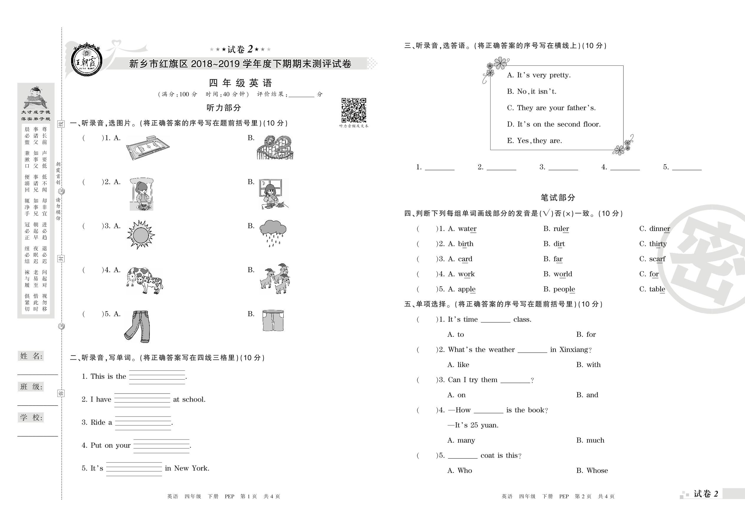 2018-2019学年第二学期新乡市红旗区四年级英语试卷(PEP版)【2】