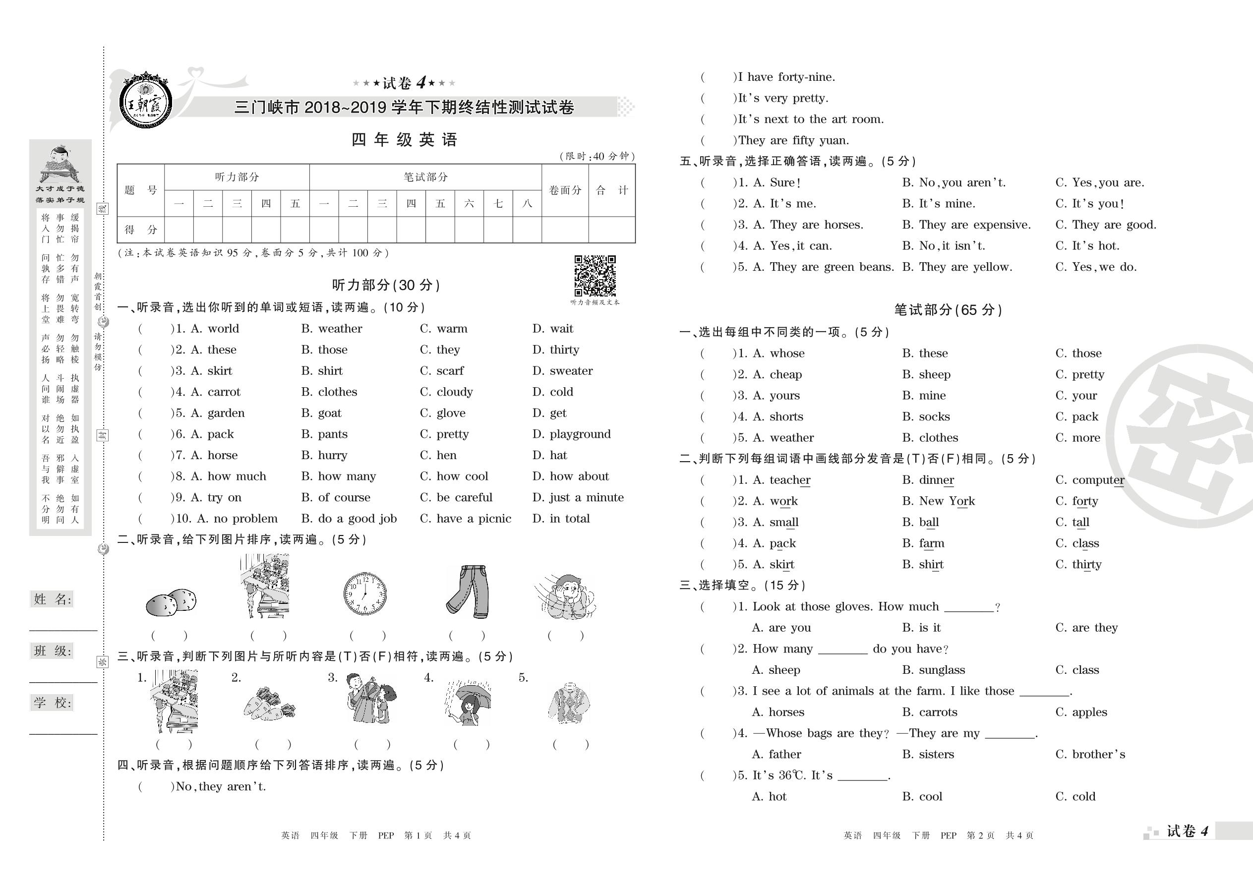 2018-2019学年第二学期三门峡市四年级英语试卷(PEP版)【4】