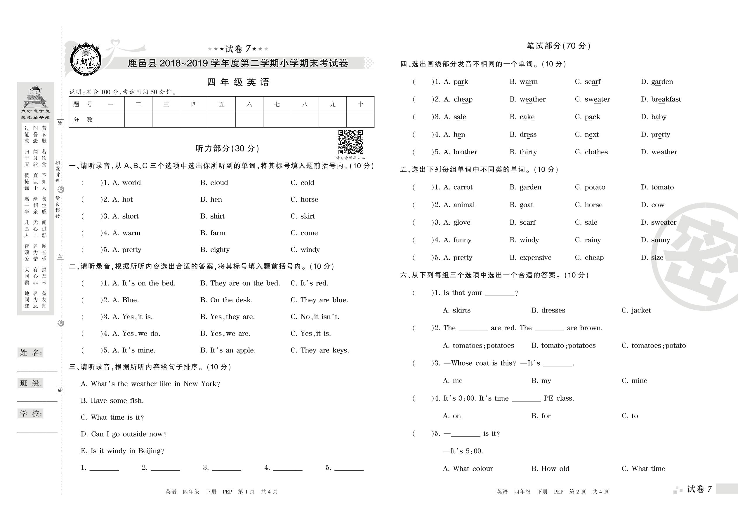 2018-2019学年第二学期周口市鹿邑县四年级英语试卷(PEP版)【7】