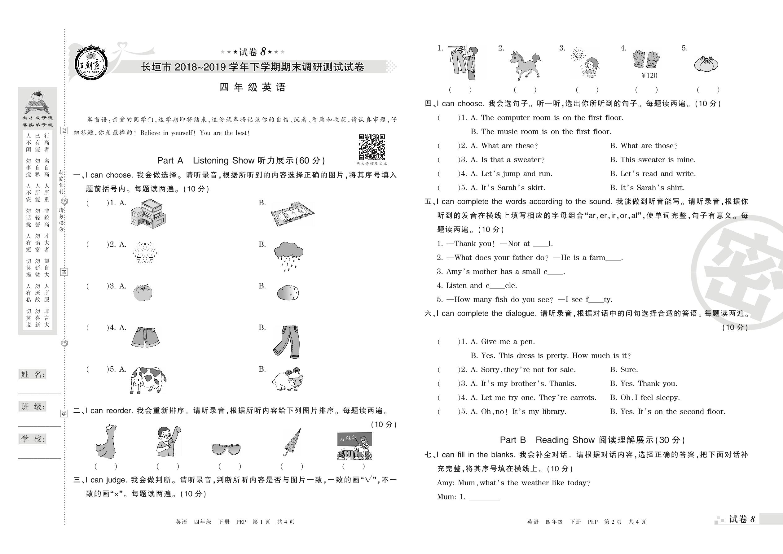 2018-2019学年第二学期长垣市四年级英语试卷(PEP版)【8】