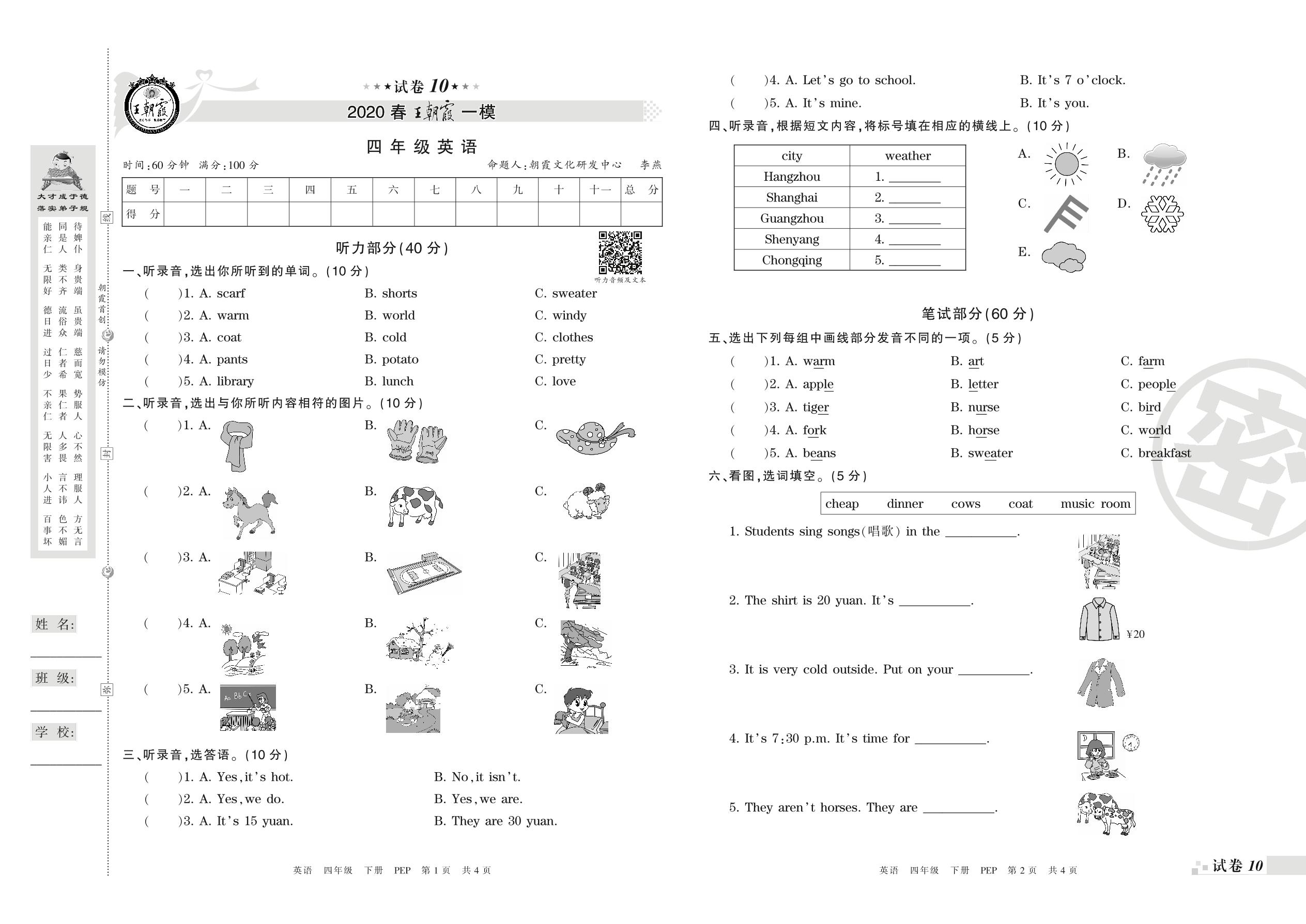 王朝霞期末模拟卷四年级下册英语(PEP版)_R21080792927【10】