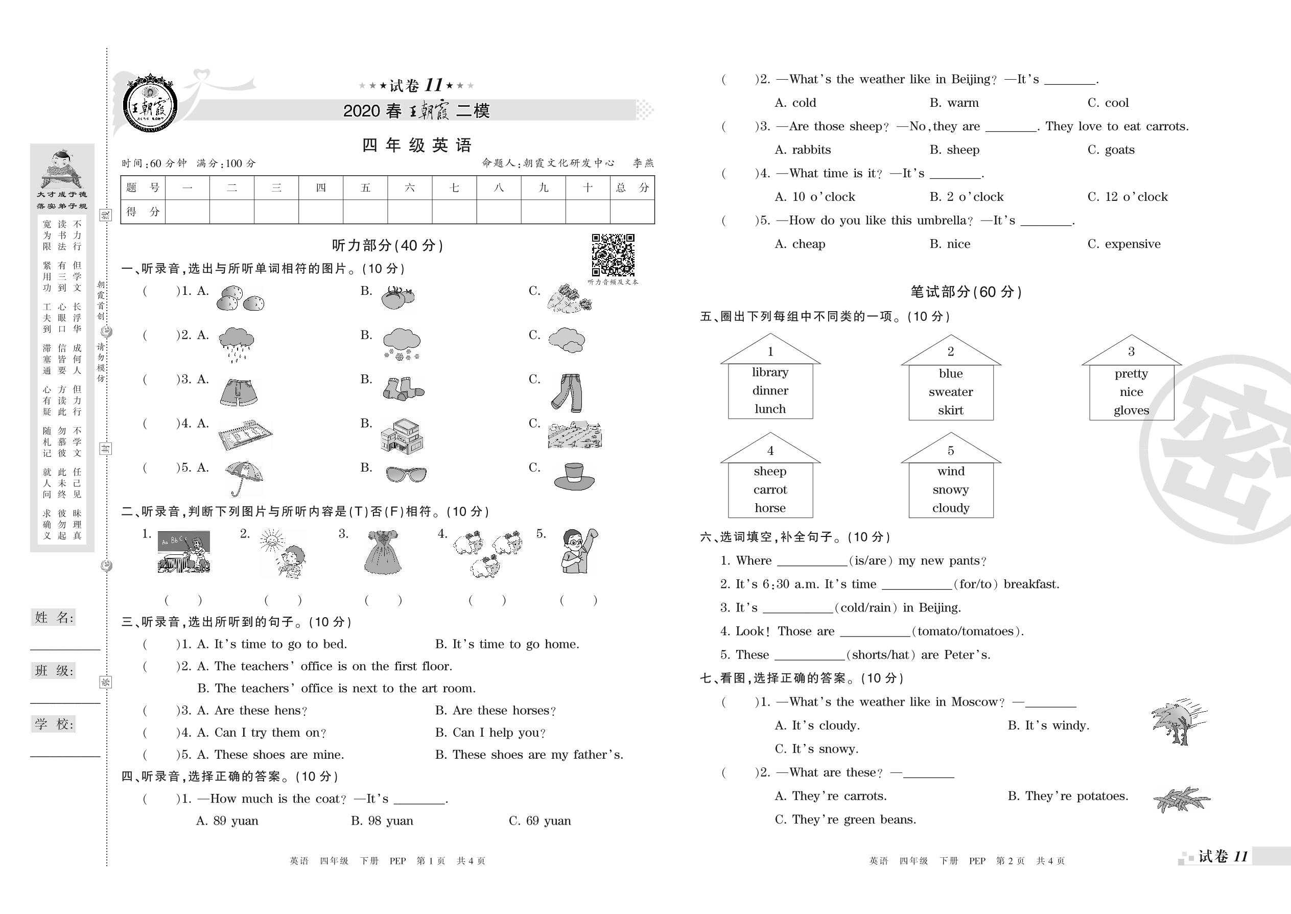 王朝霞期末模拟卷四年级下册英语(PEP版)_R21080792934【11】