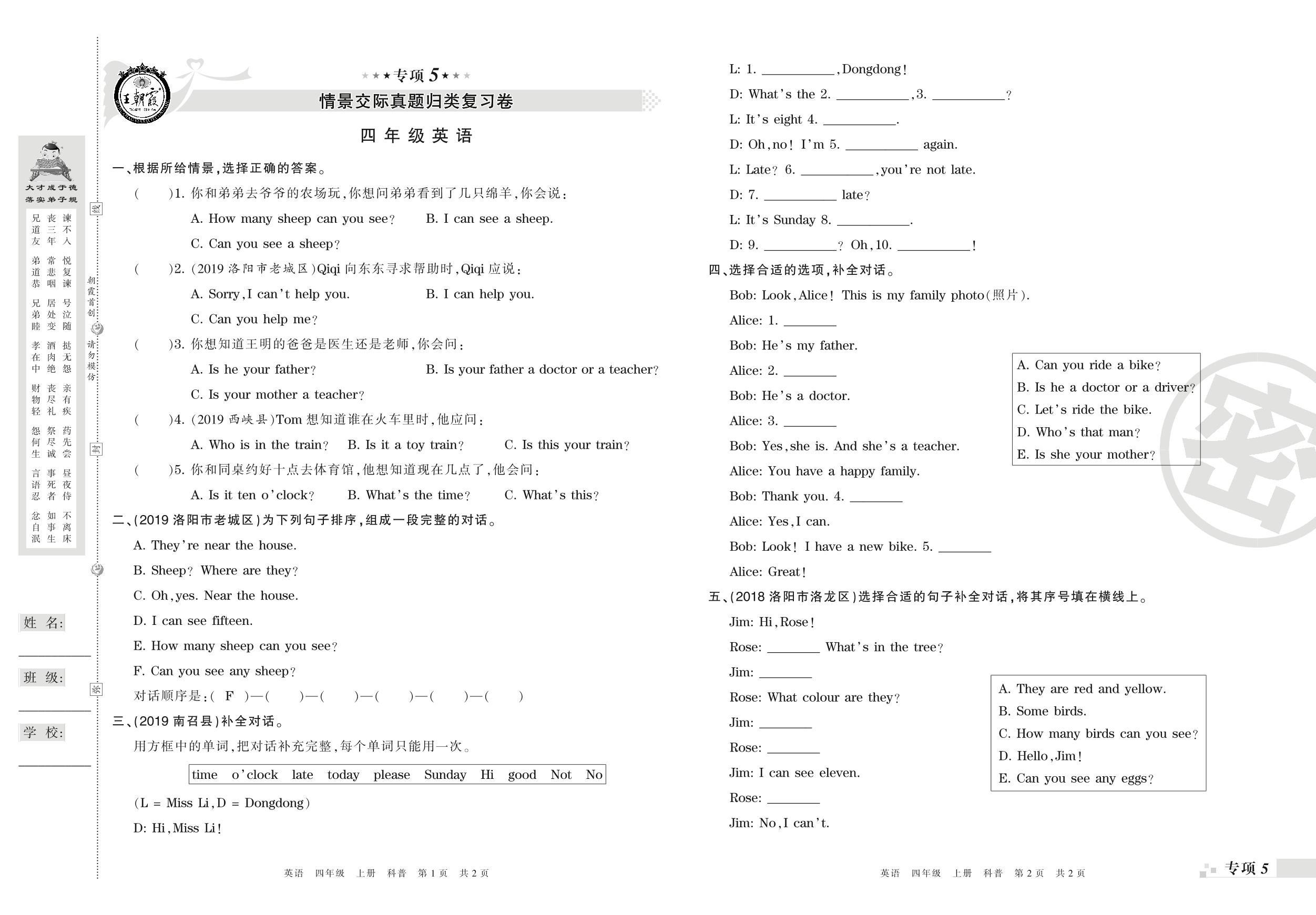 王朝霞期末专项卷——情景交际、阅读理解真题归类复习四年级上册英语(科普版)_R21080792959【0】