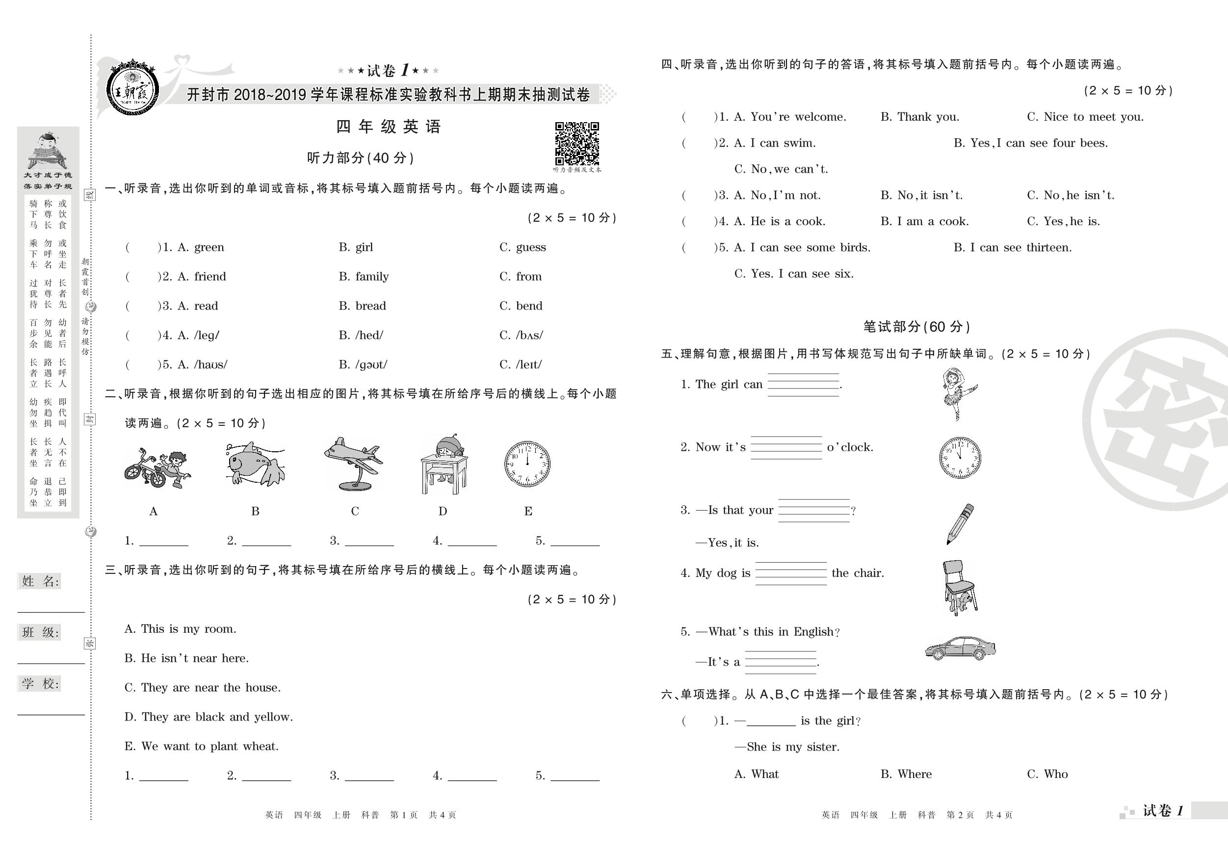 2018-2019学年第一学期开封市四年级英语试卷(科普版)【1】