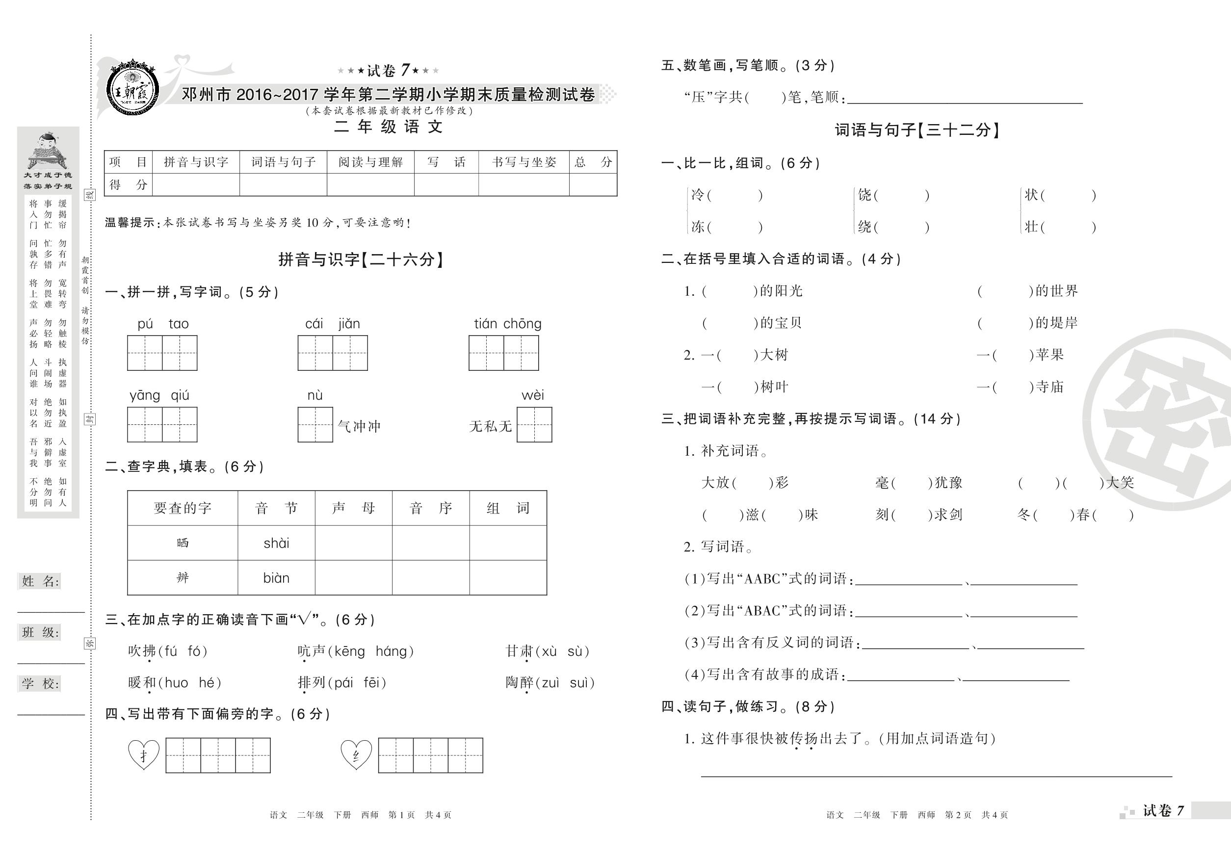 2016-2017学年第二学期邓州市二年级语文试卷(西师版)【7】