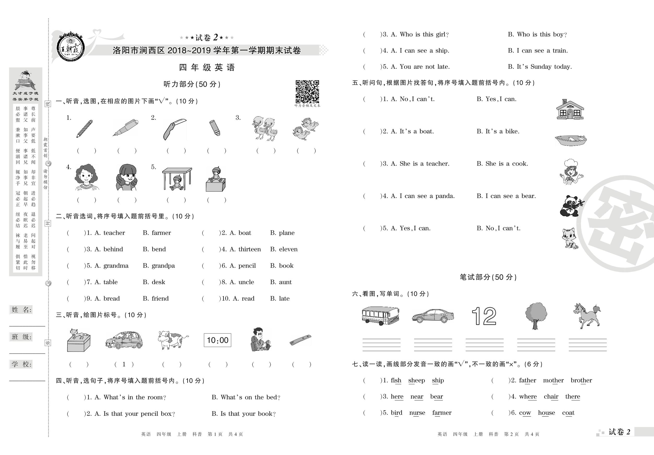 2018-2019学年第一学期洛阳市涧西区四年级英语试卷(科普版)_R211111144047823【2】