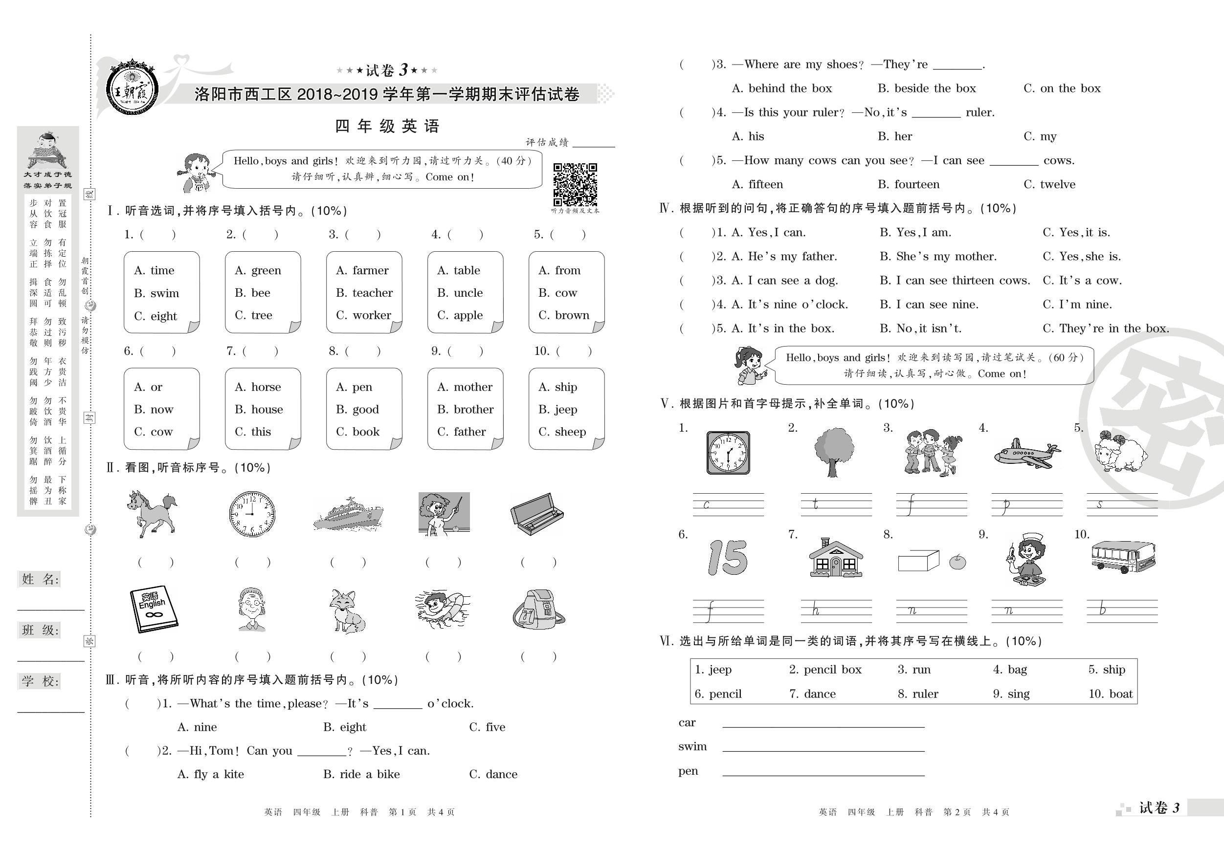 2018-2019学年第一学期洛阳市西工区四年级英语试卷(科普版)【3】