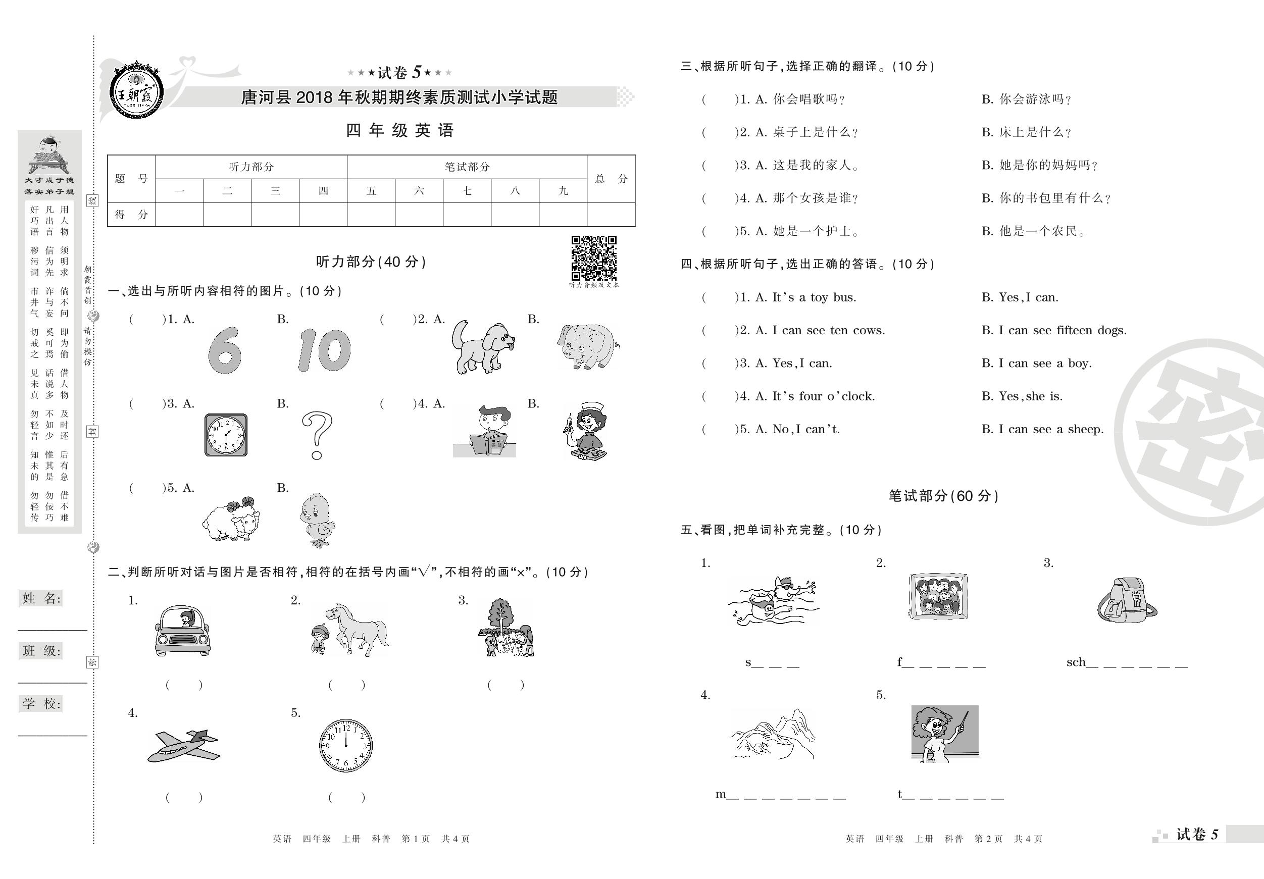 2018-2019学年第一学期南阳市唐河县四年级英语试卷(科普版)【5】