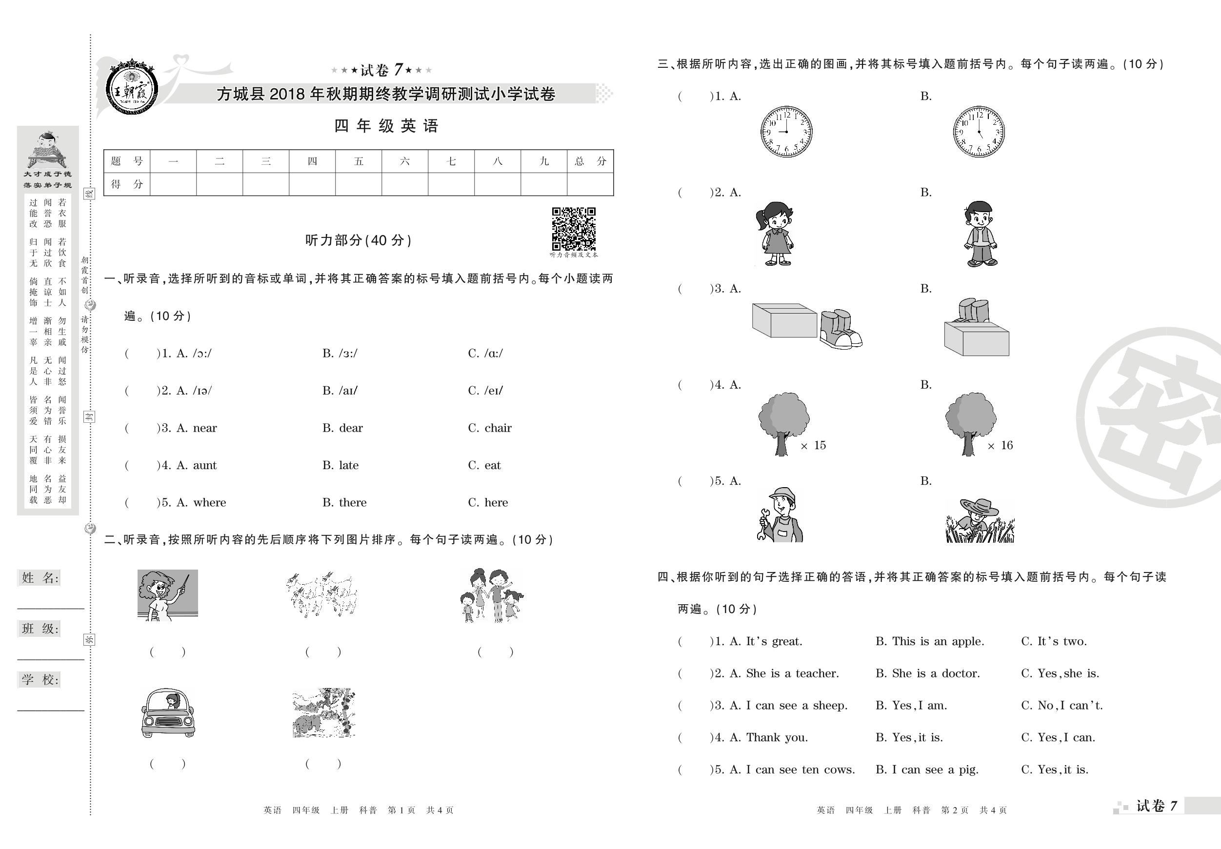 2018-2019学年第一学期南阳市方城县四年级英语试卷(科普版)【7】
