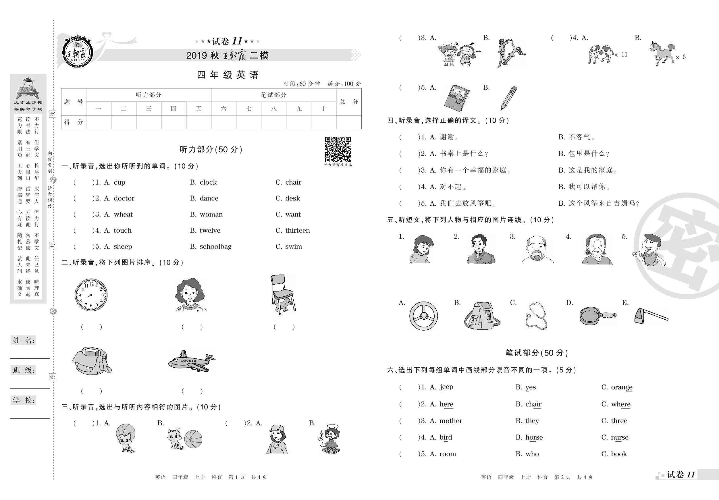 王朝霞期末模拟卷四年级上册英语(科普版)_R21080793041【11】