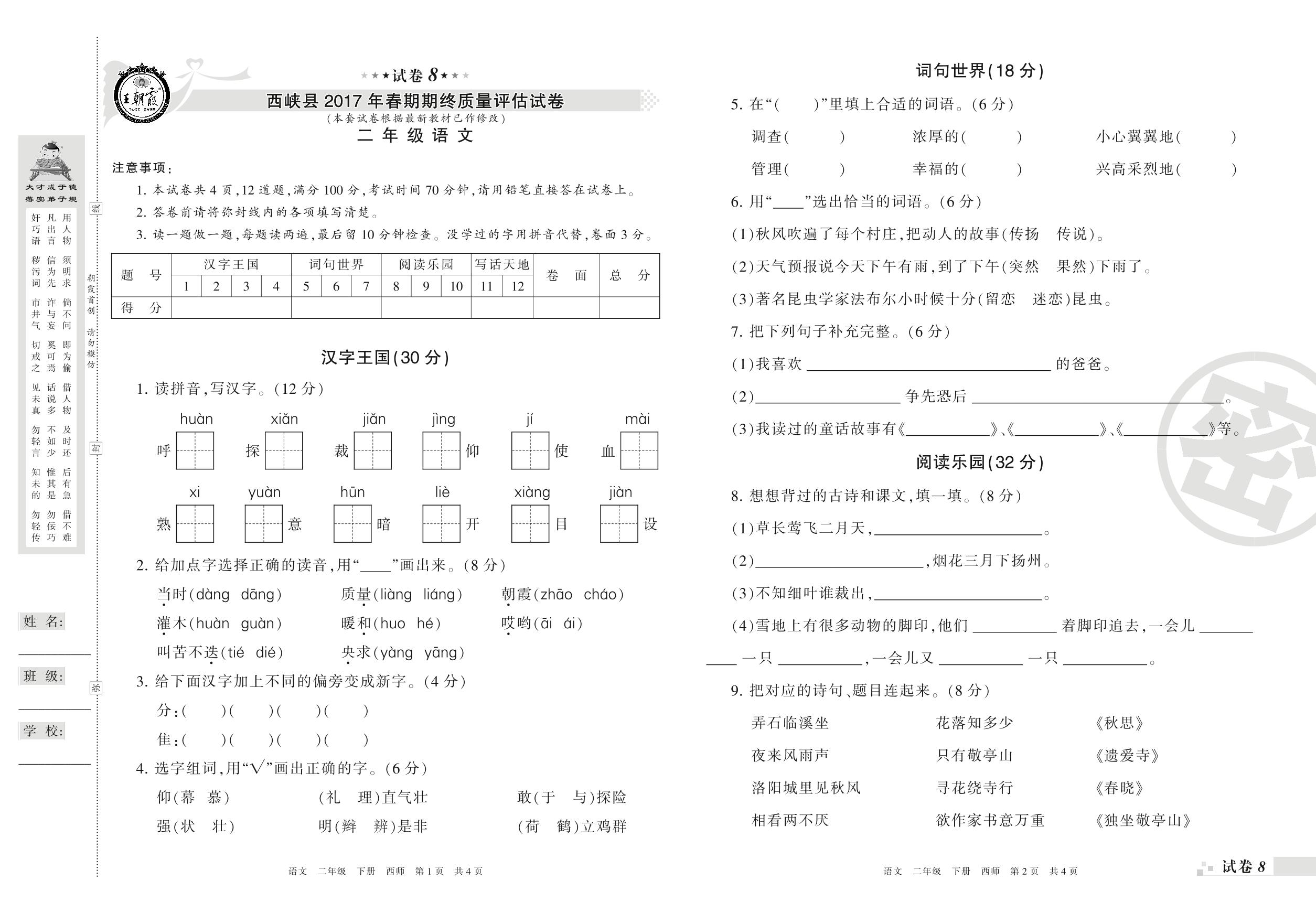 二年级语文西师版下册期末卷