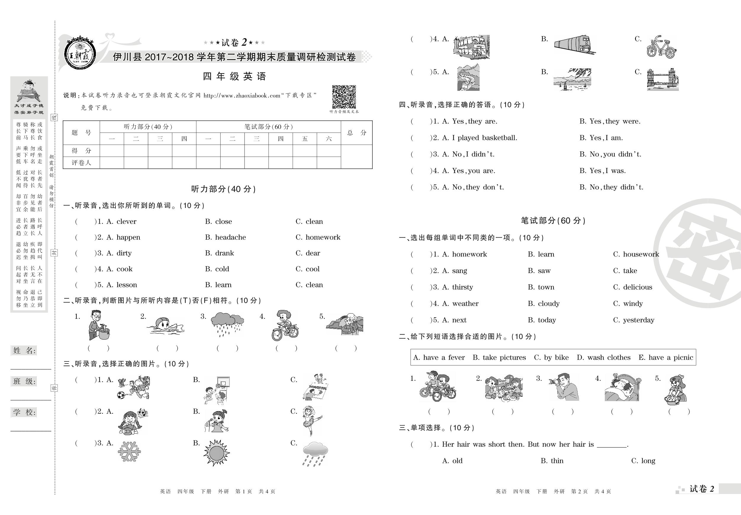 2017-2018学年第二学期洛阳市伊川县四年级英语试卷(外研版)【2】