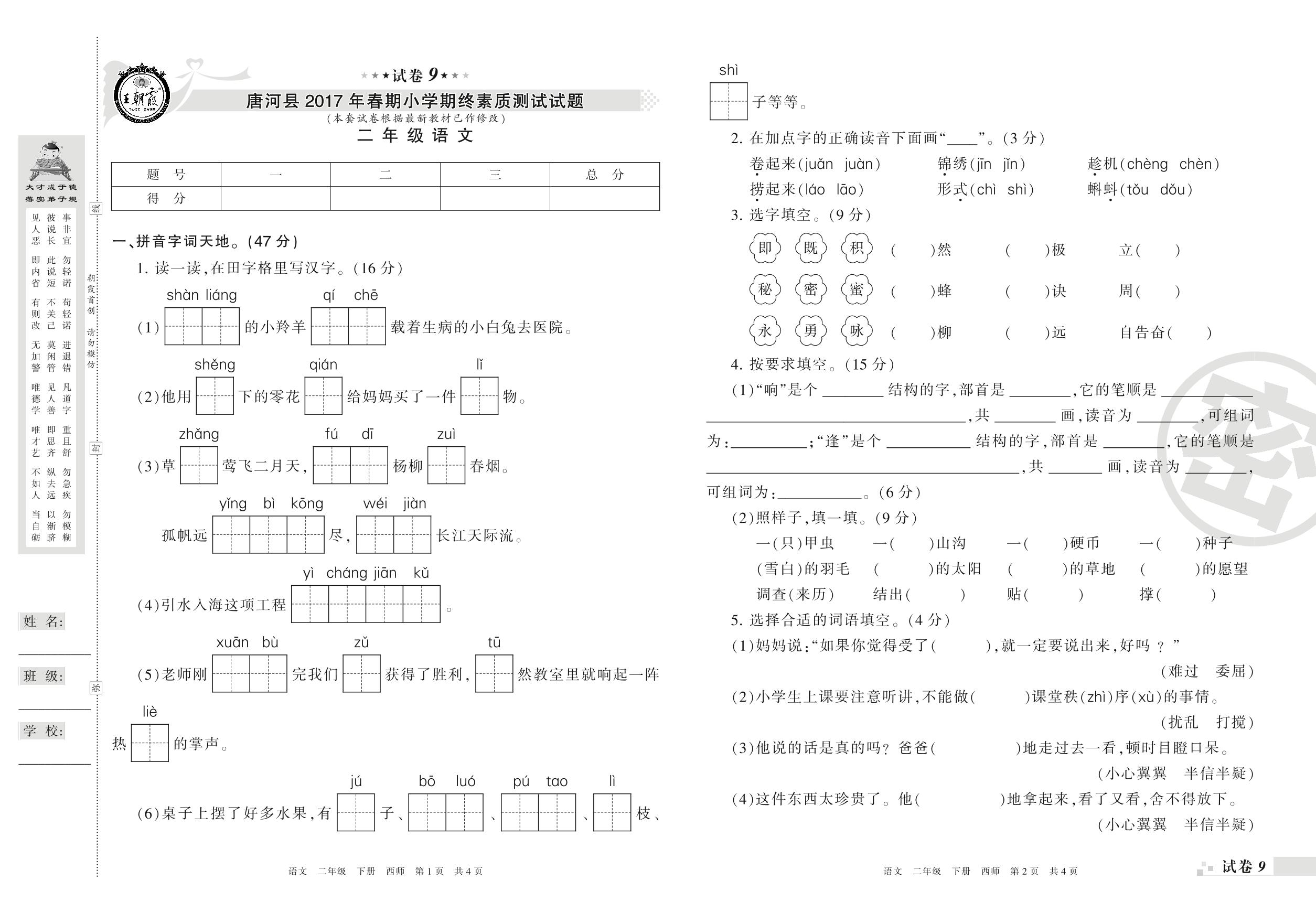 2016-2017学年第二学期南阳市唐河县二年级语文试卷(西师版)【9】