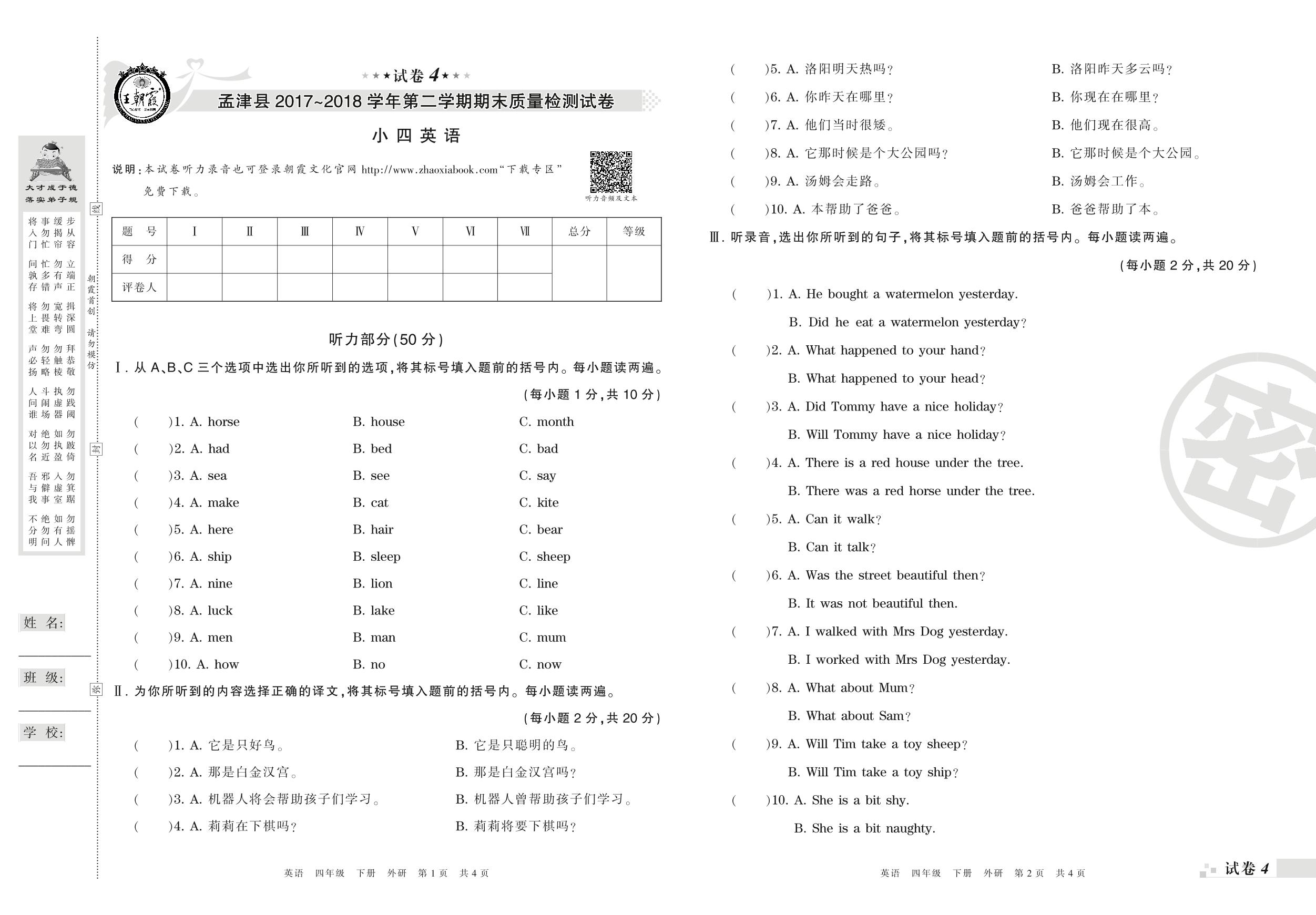 2017-2018学年第二学期洛阳市孟津县四年级英语试卷(外研版)【4】