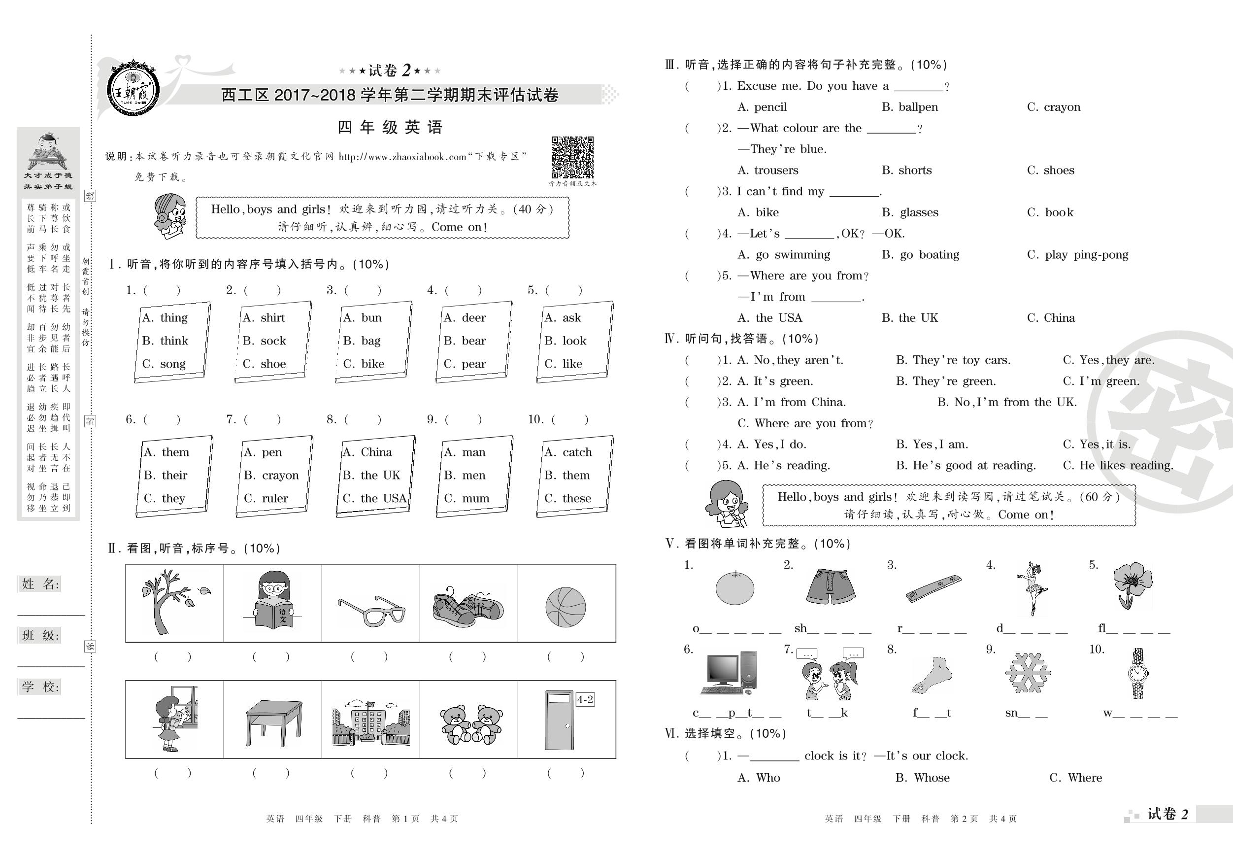 2017-2018学年第二学期洛阳市西工区四年级英语试卷(科普版)【2】