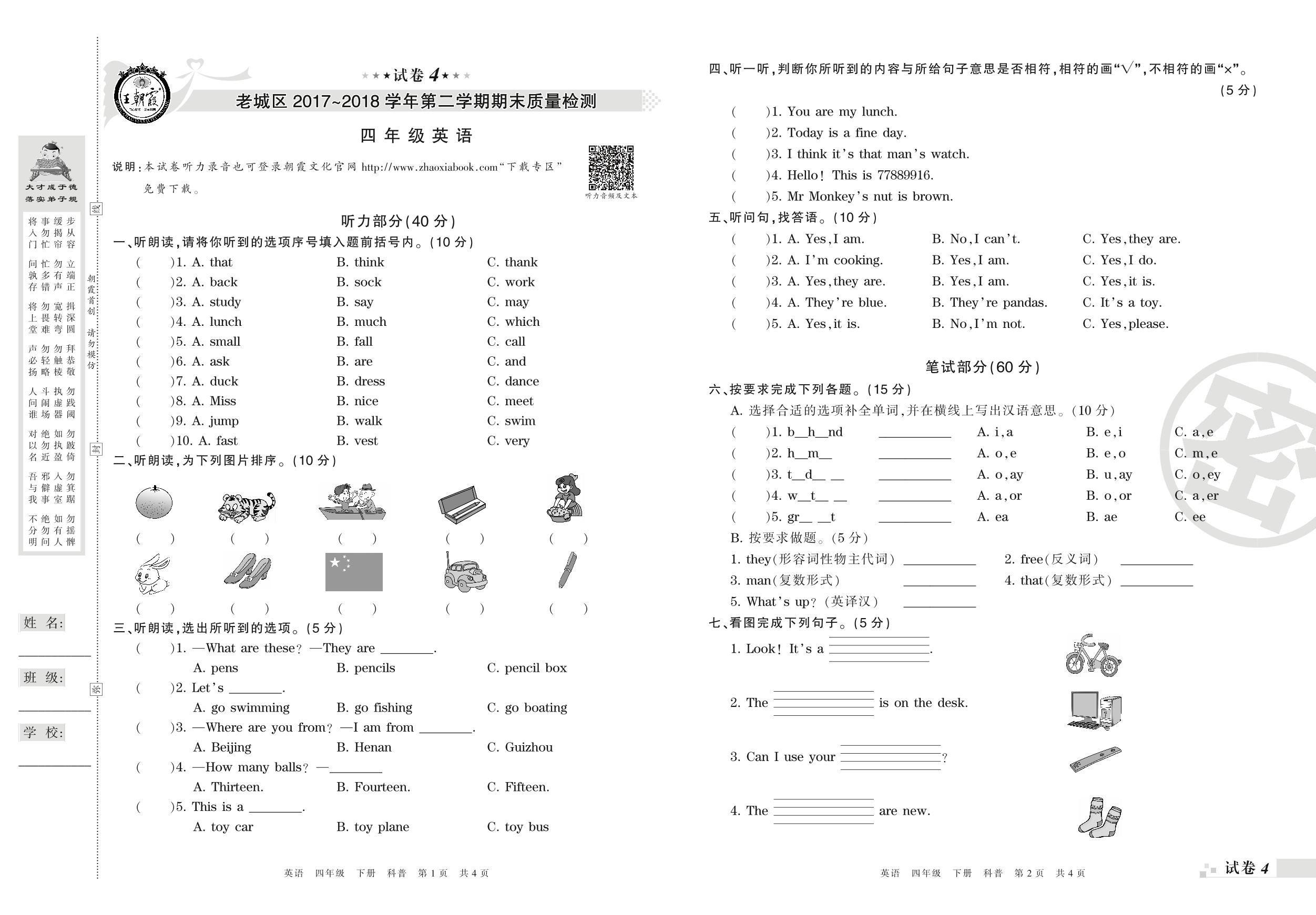 2017-2018学年第二学期洛阳市老城区四年级英语试卷(科普版)【4】