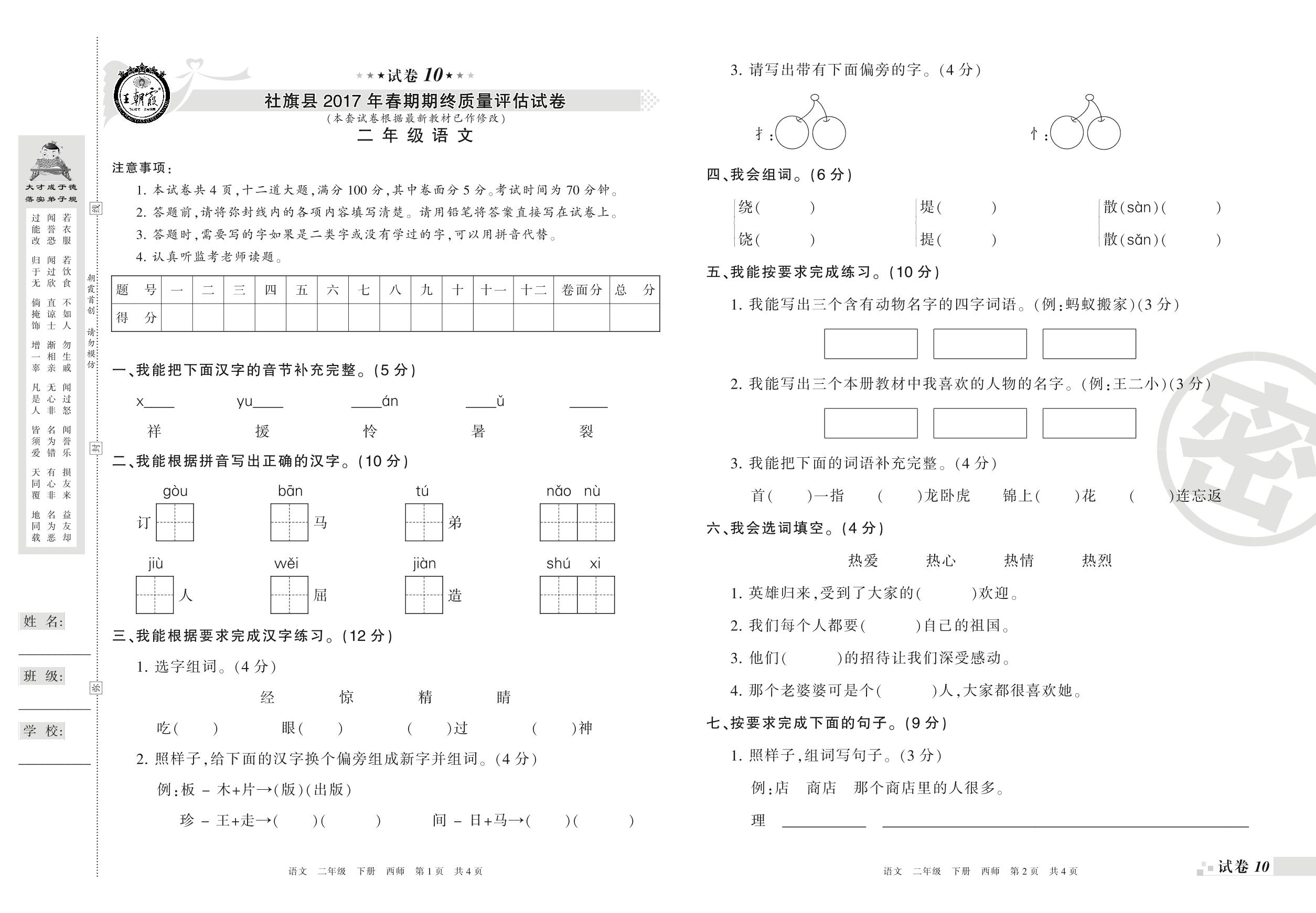 2016-2017学年第二学期南阳市社旗县二年级语文试卷(西师版)【10】