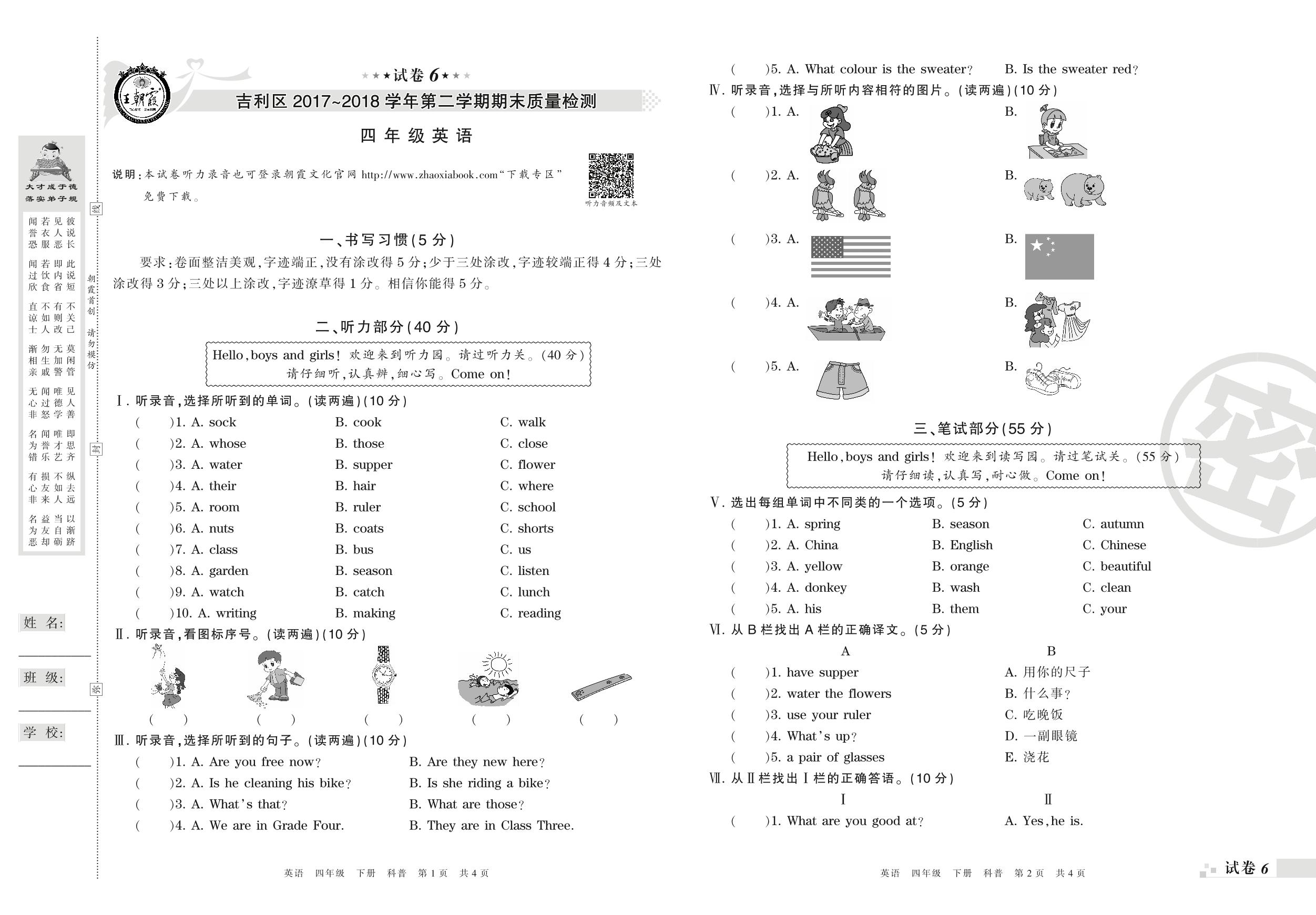 2016-2017学年第二学期洛阳市吉利区四年级英语试卷(科普版)【6】