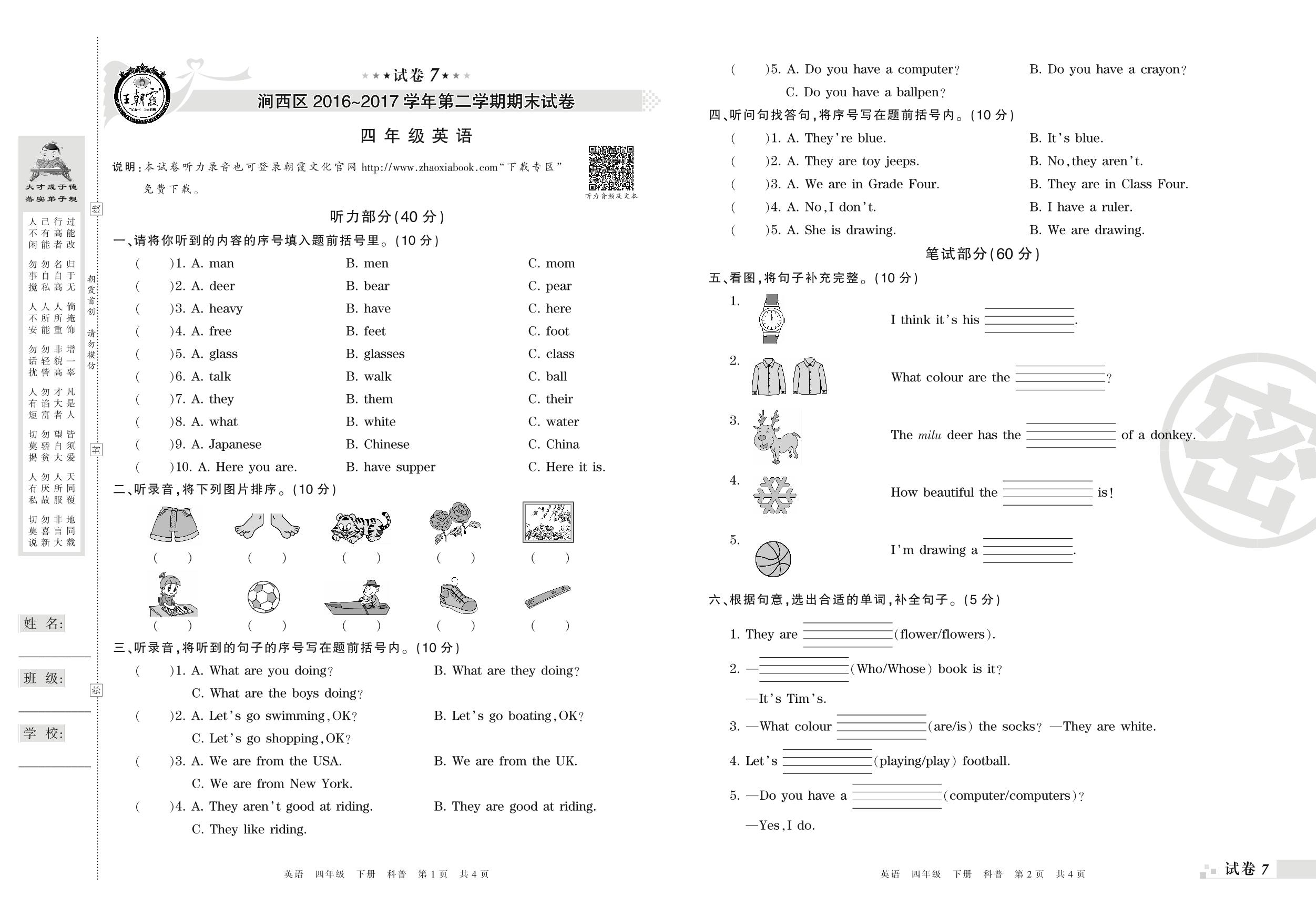 2016-2017学年第二学期洛阳市涧西区四年级英语试卷(科普版)_R21080793216【7】