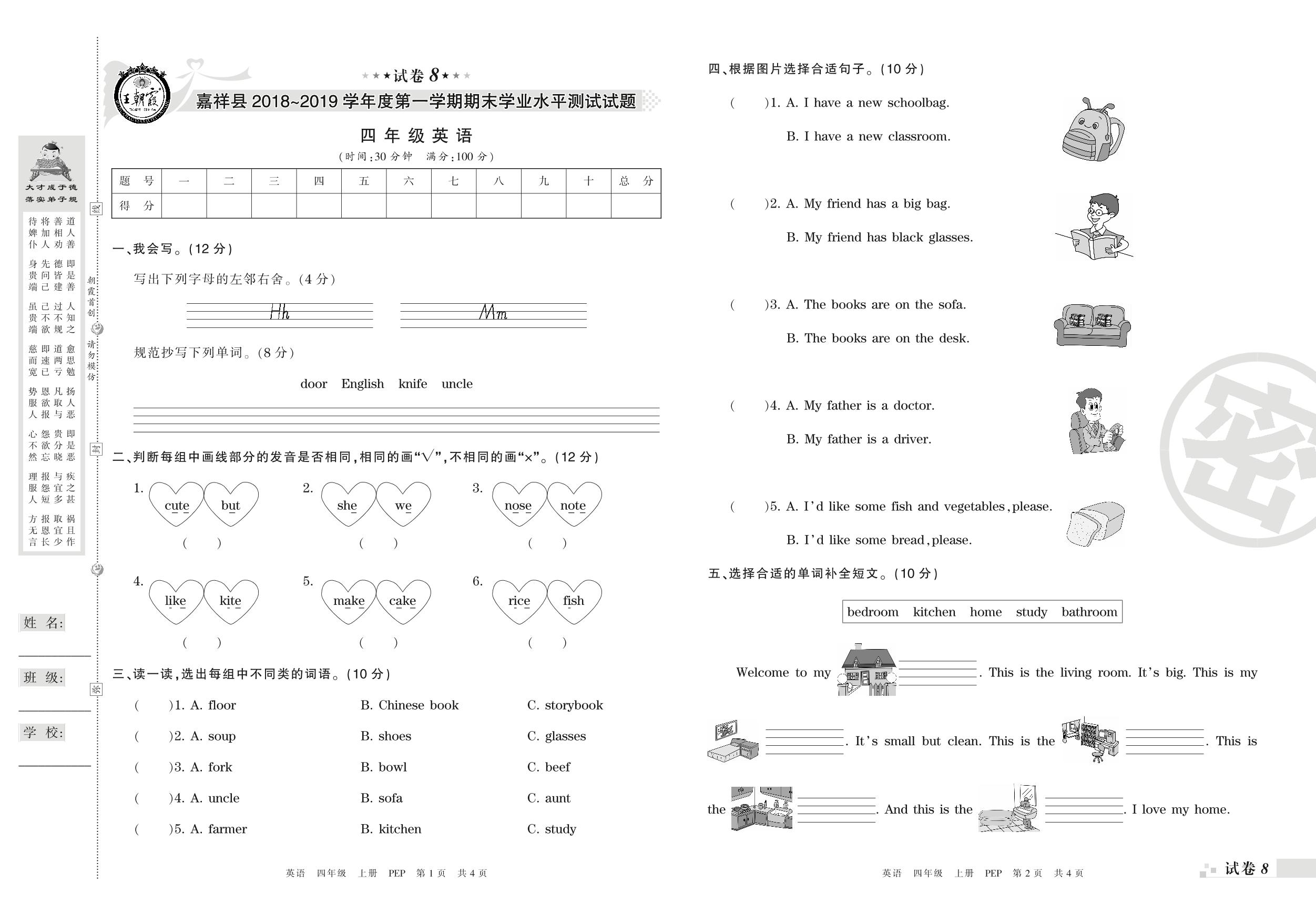 2018-2019学年第一学期济宁市嘉祥县四年级英语试卷(PEP版)【8】