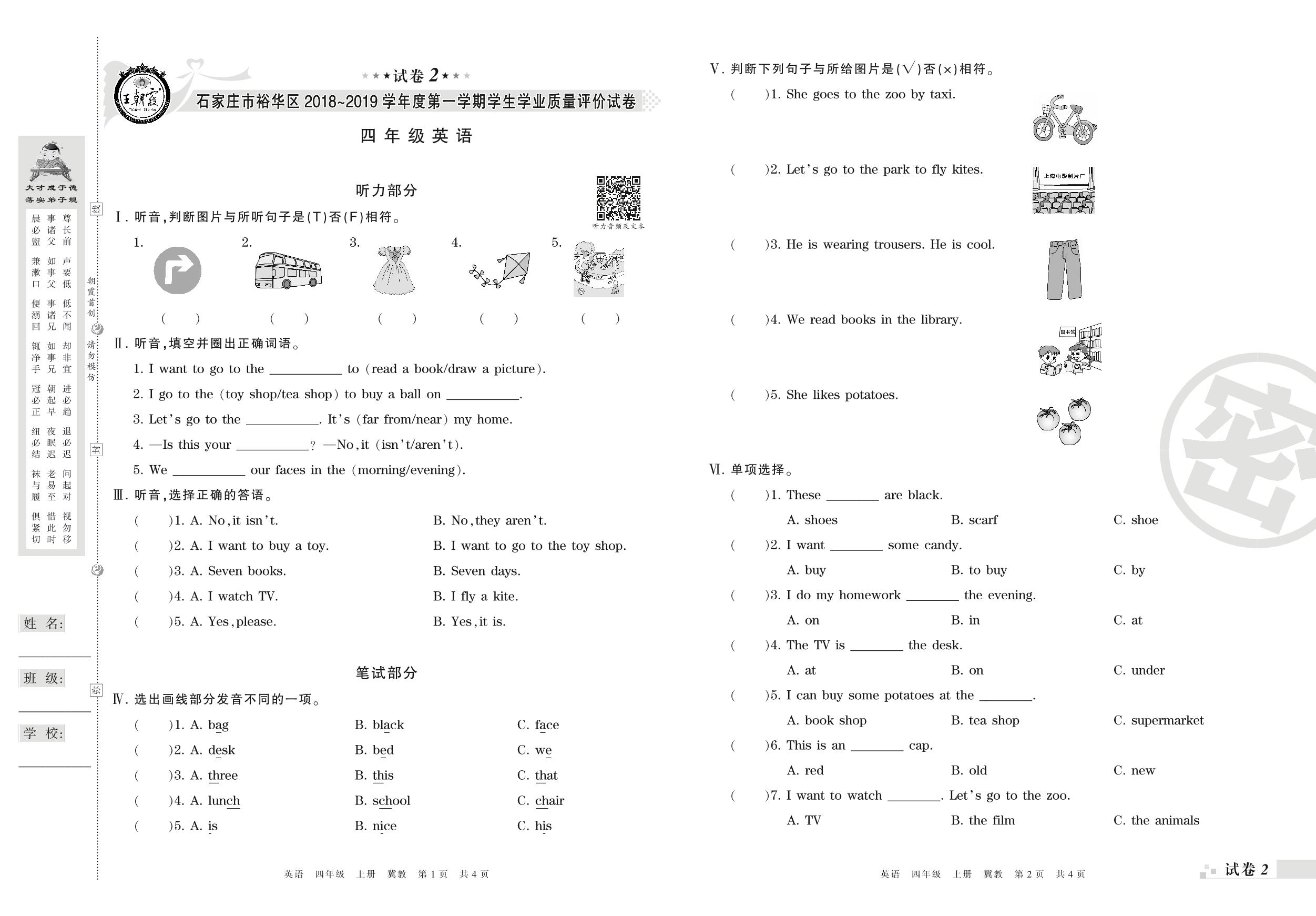 2018-2019学年第一学期石家庄市裕华区四年级英语试卷(冀教版)【2】