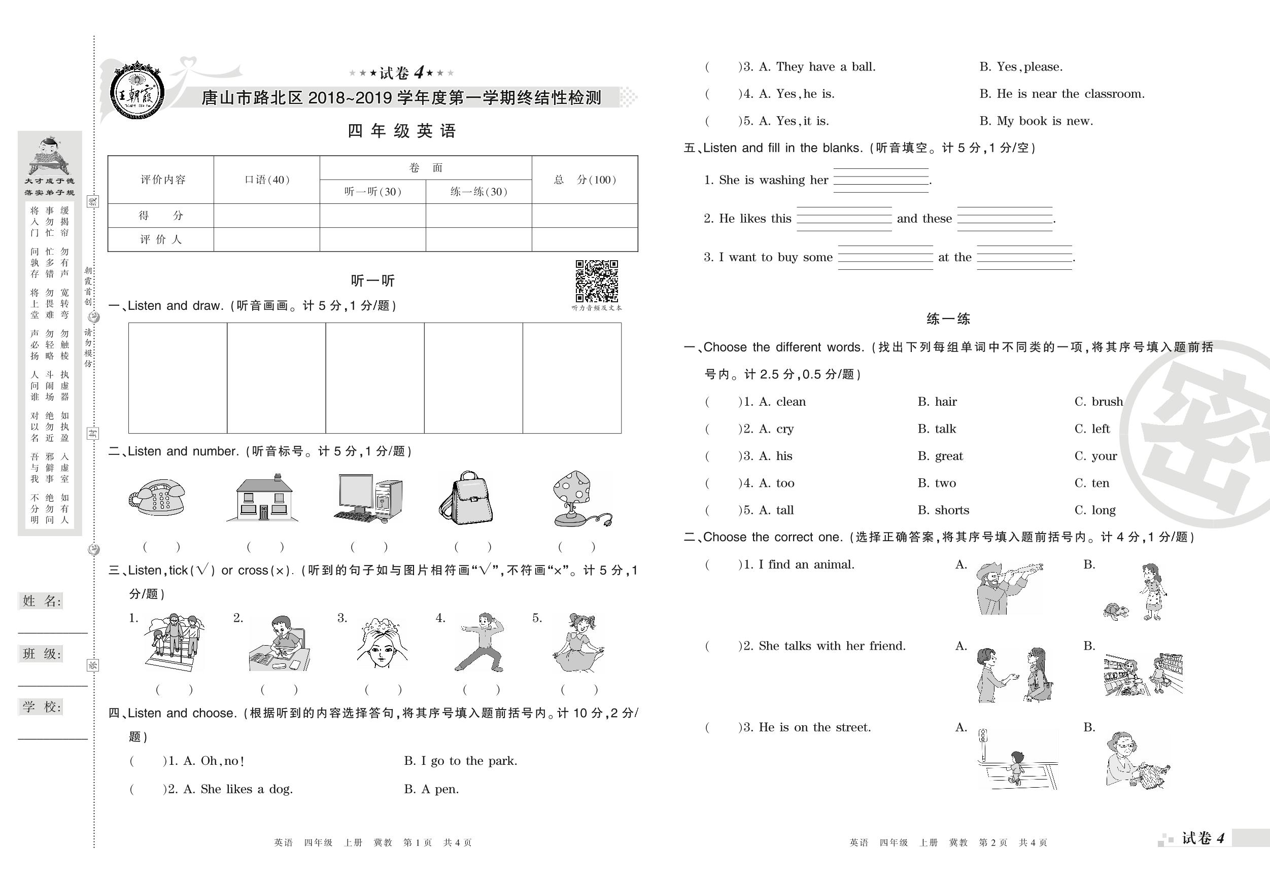 2018-2019学年第一学期唐山市路北区四年级英语试卷(冀教版)【4】