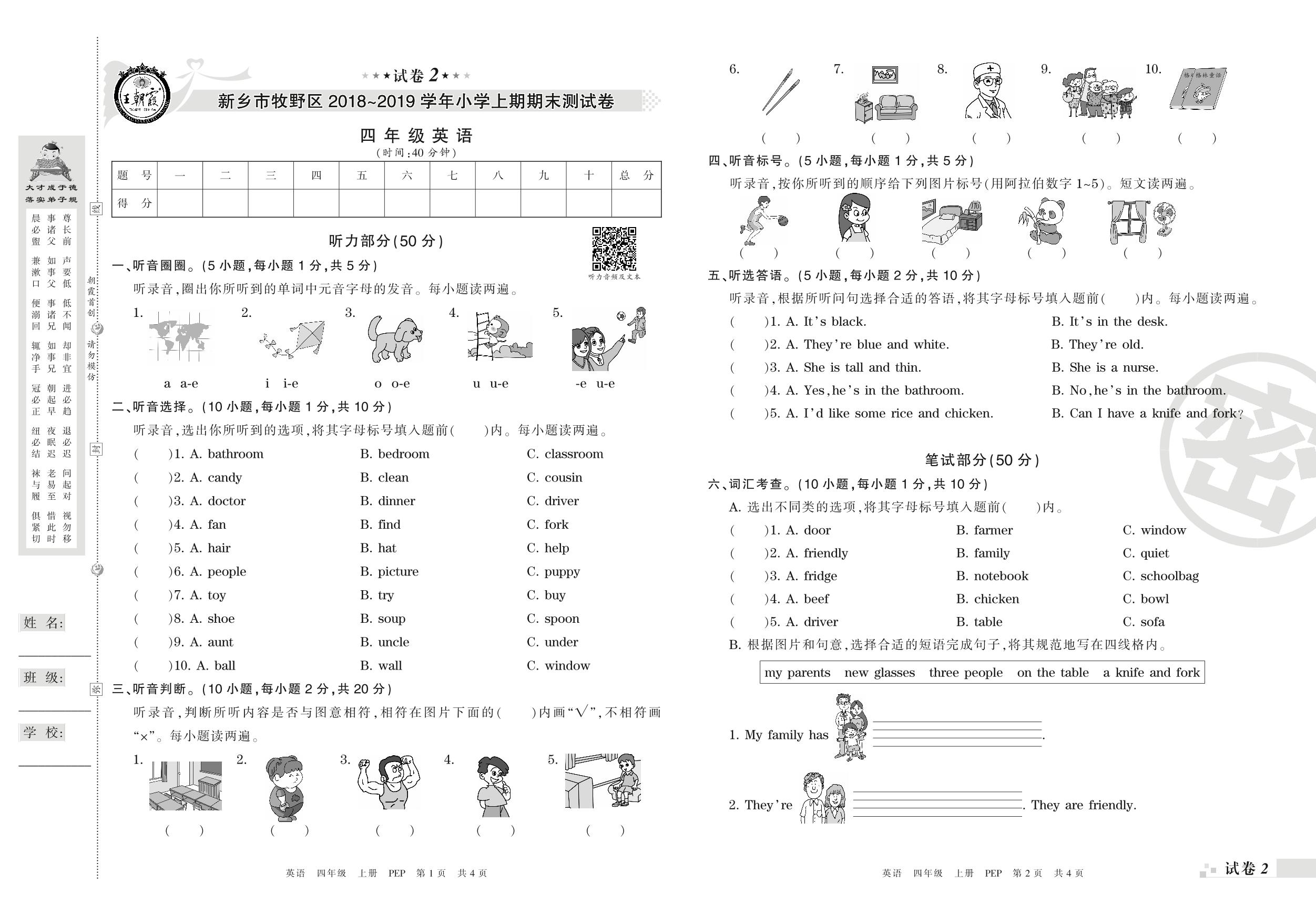 2018-2019学年第一学期新乡市牧野区四年级英语试卷(PEP版)【2】