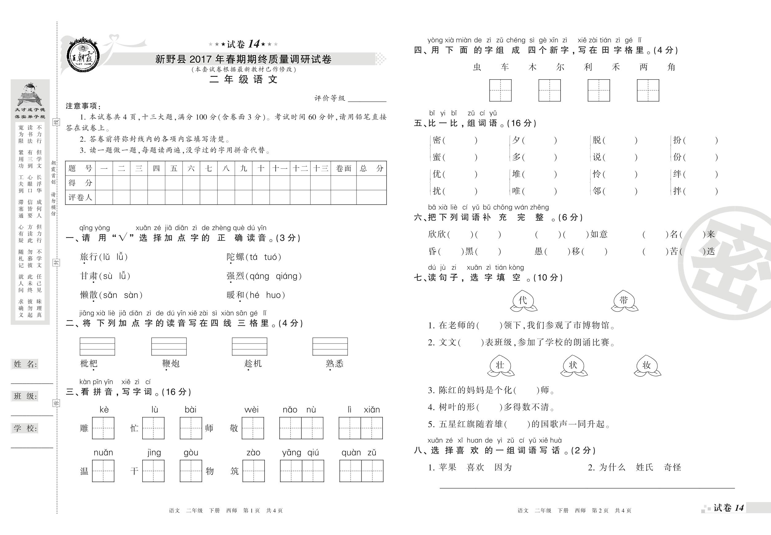 2016-2017学年第二学期南阳市新野县二年级语文试卷(西师版)【14】