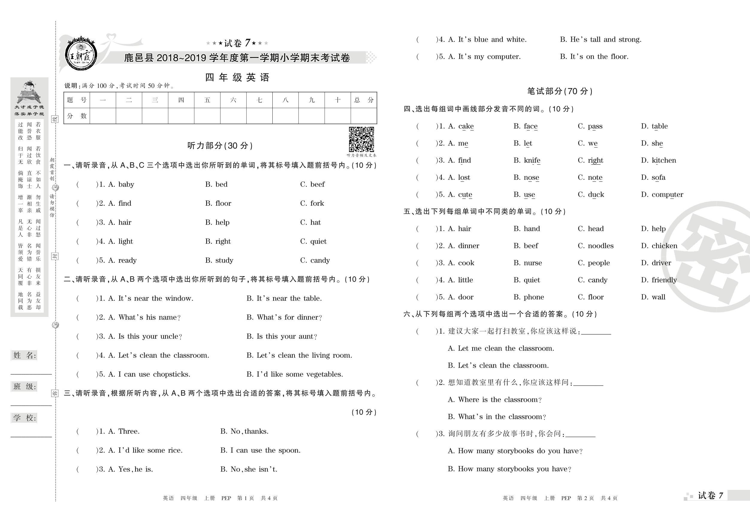 2018-2019学年第一学期周口市鹿邑县四年级英语试卷(PEP版)【7】