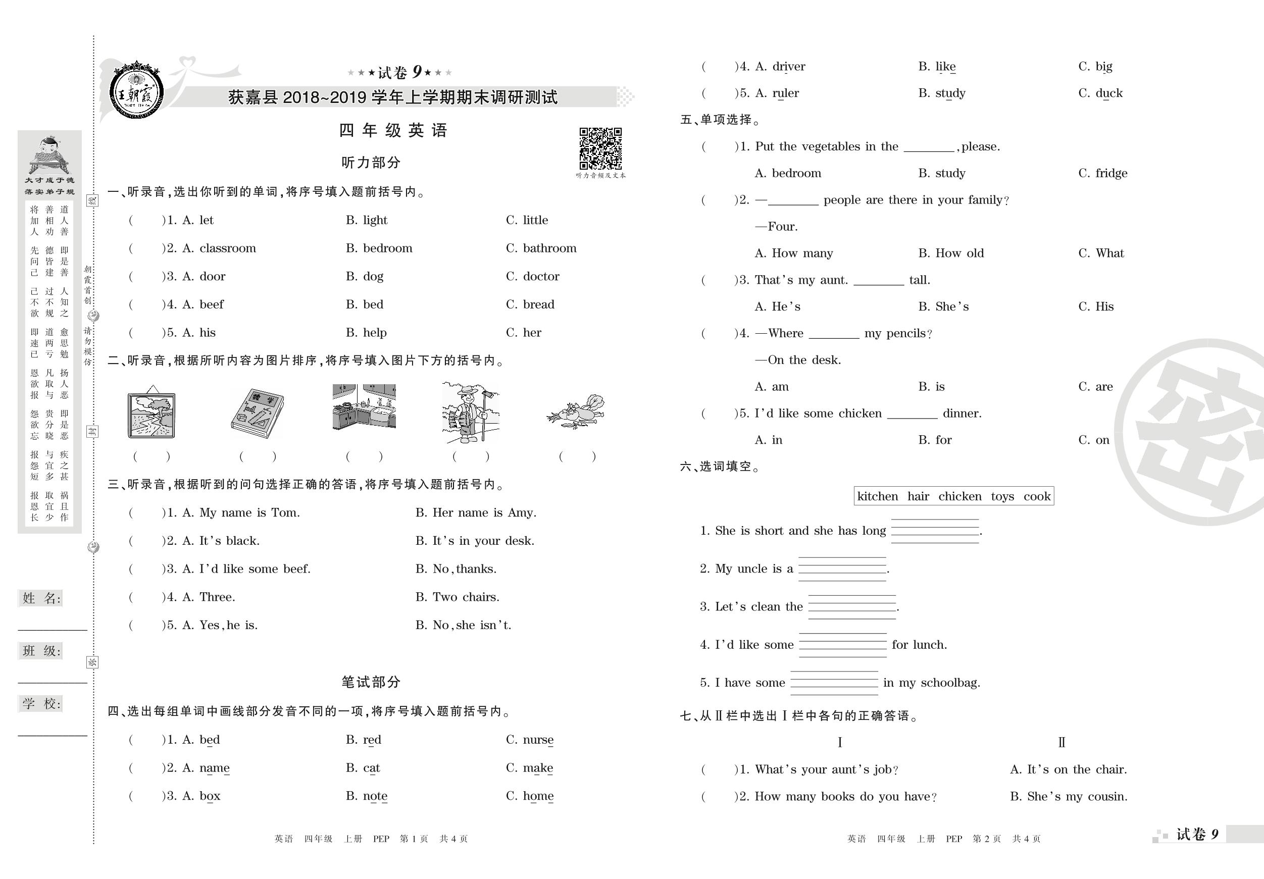 2018-2019学年第一学期新乡市获嘉县四年级英语试卷(PEP版)【9】