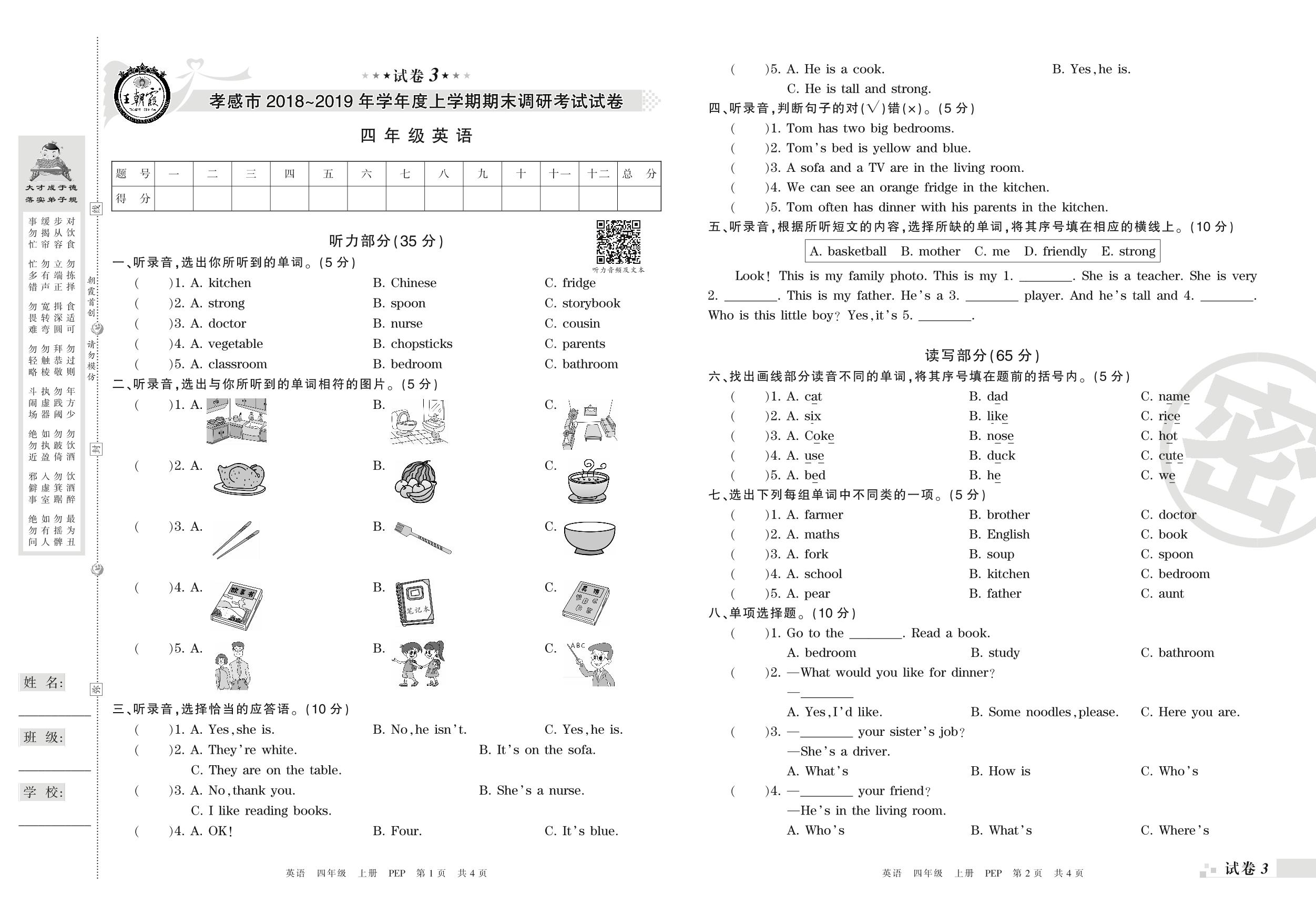 2018-2019学年第一学期孝感市四年级英语试卷(PEP版)【3】