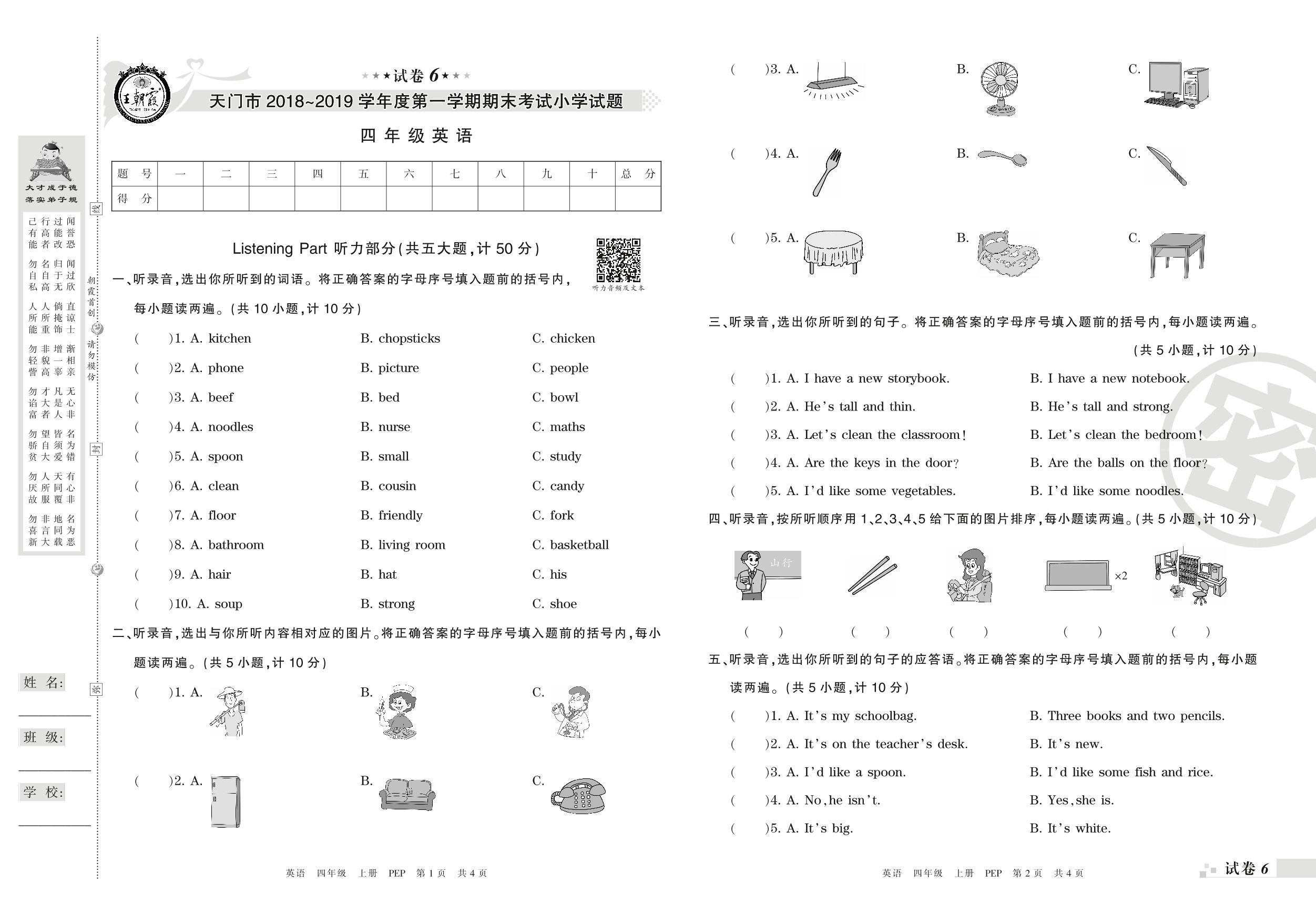 2018-2019学年第一学期天门市四年级英语试卷(PEP版)【6】