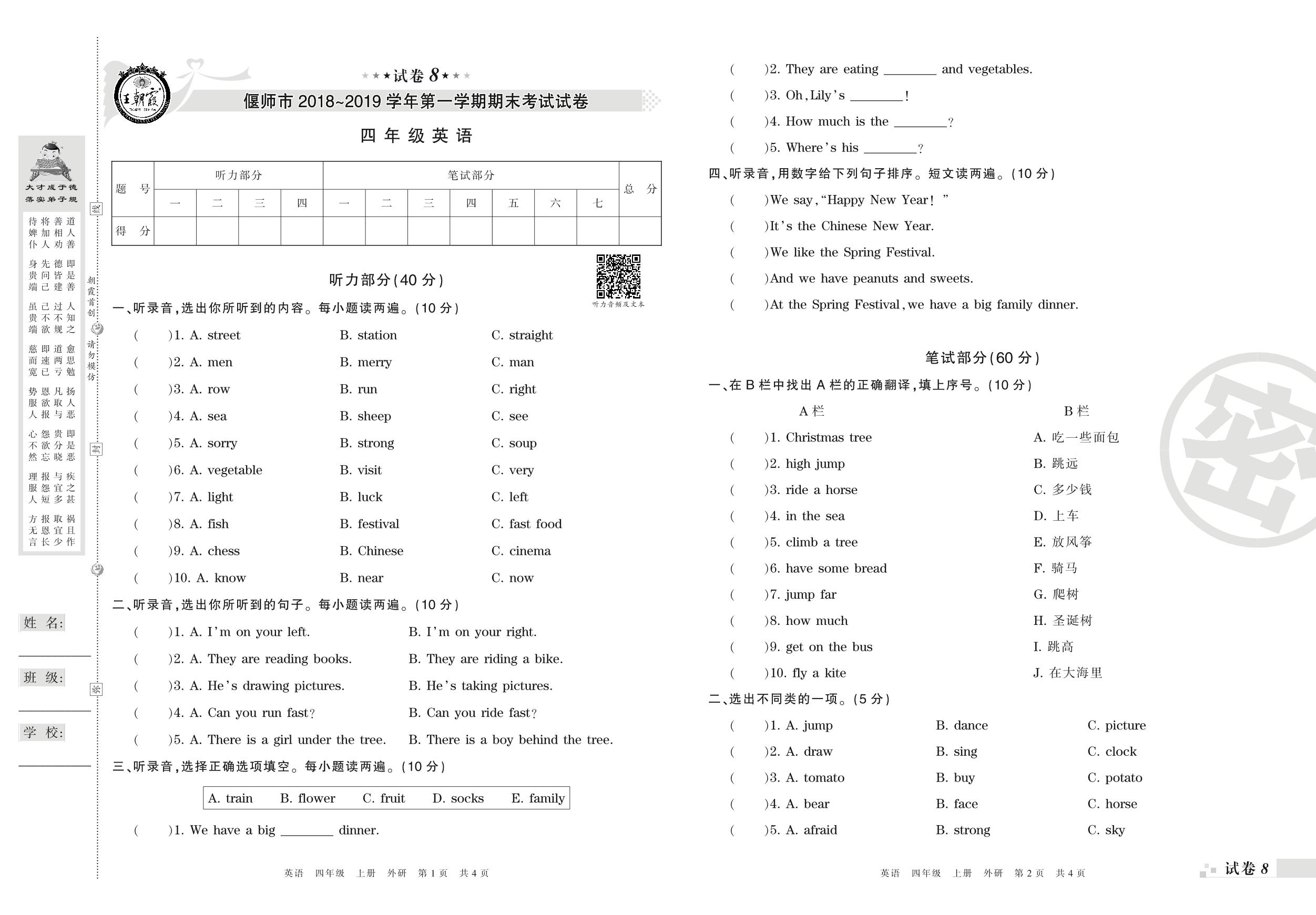 2018-2019学年第一学期偃师市四年级英语试卷(外研版)【8】