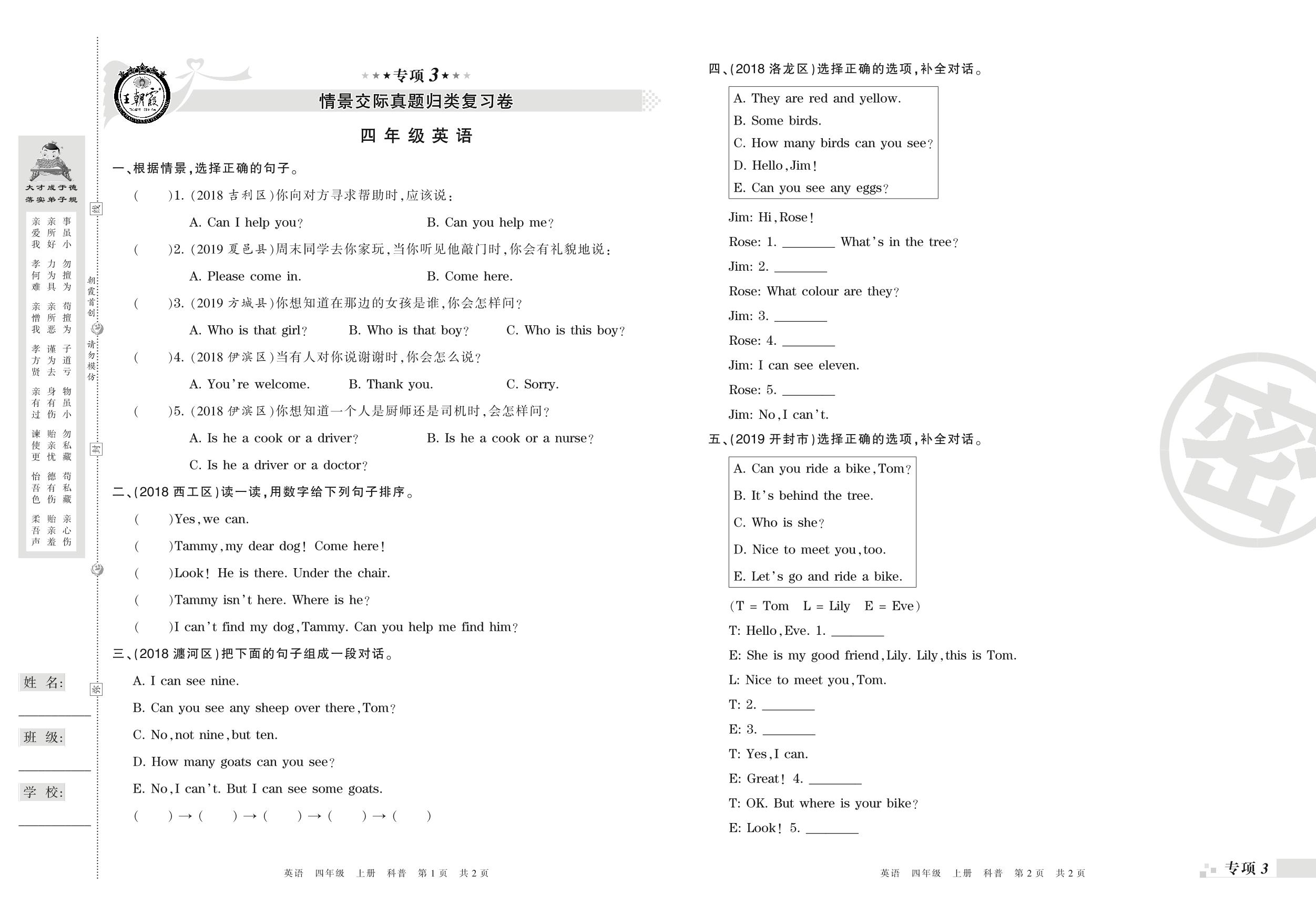 王朝霞期末专项卷——情景交际、阅读理解真题归类复习四年级上册英语(科普版)_R21080793743【0】