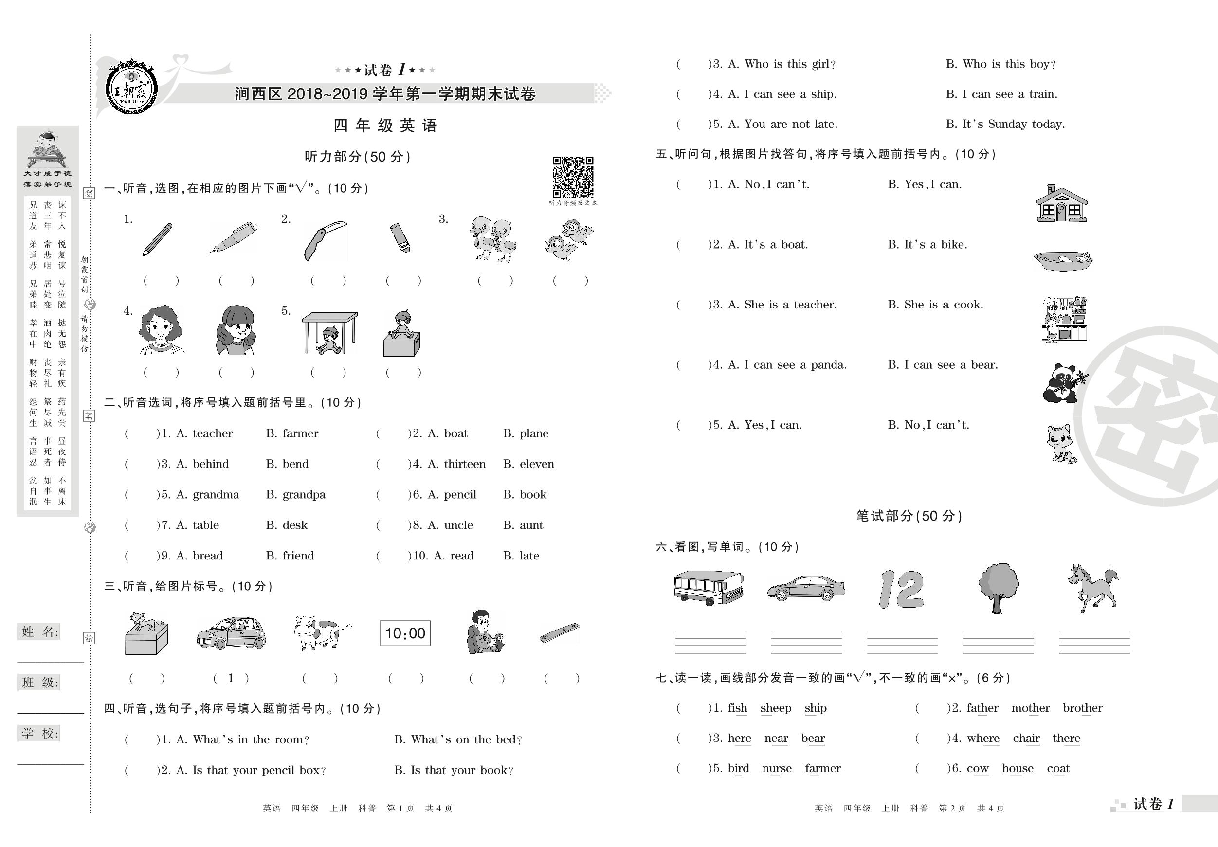 2018-2019学年第一学期洛阳市涧西区四年级英语试卷(科普版)【1】