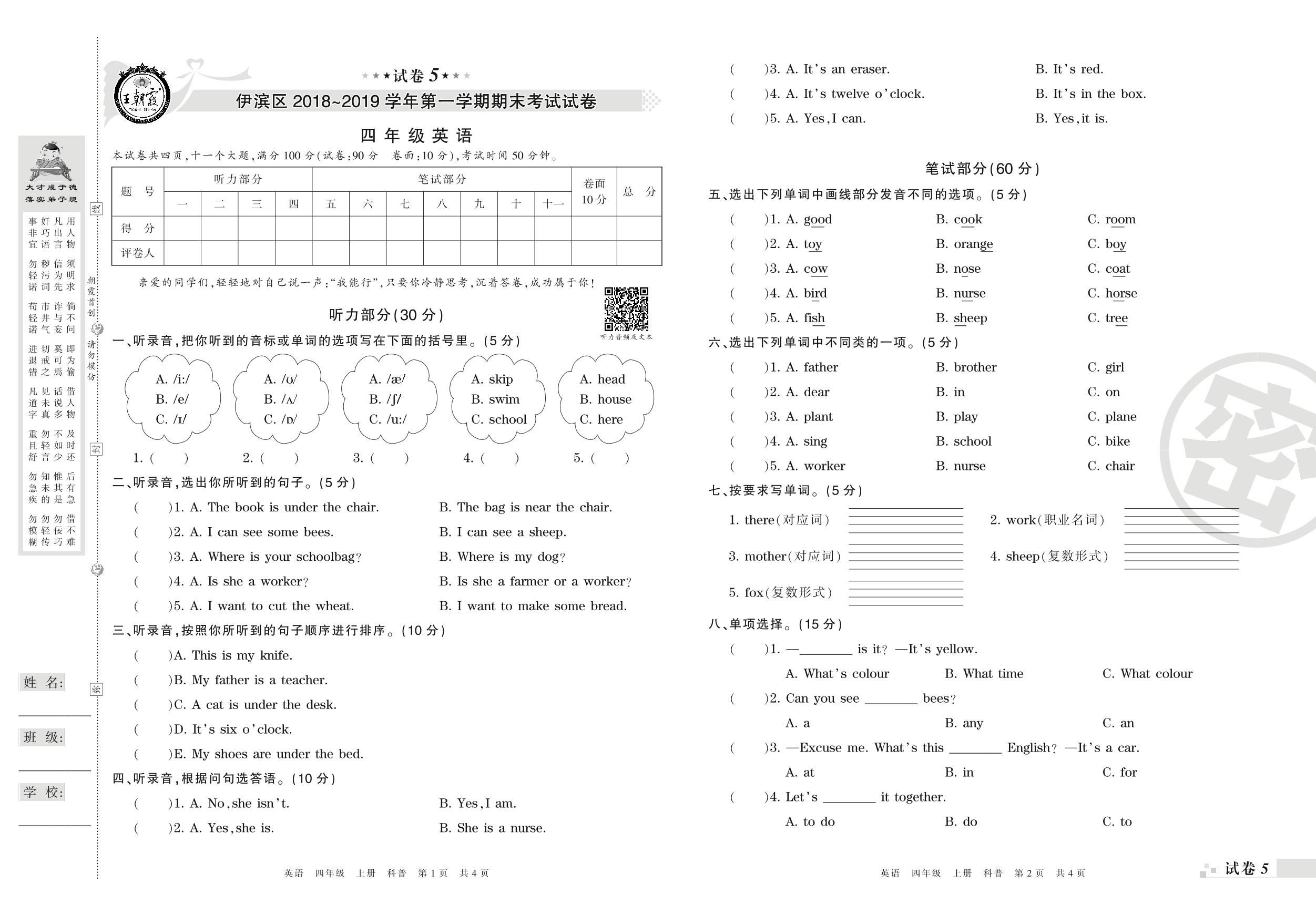 2018-2019学年第一学期洛阳市伊滨区四年级英语试卷(科普版)【5】
