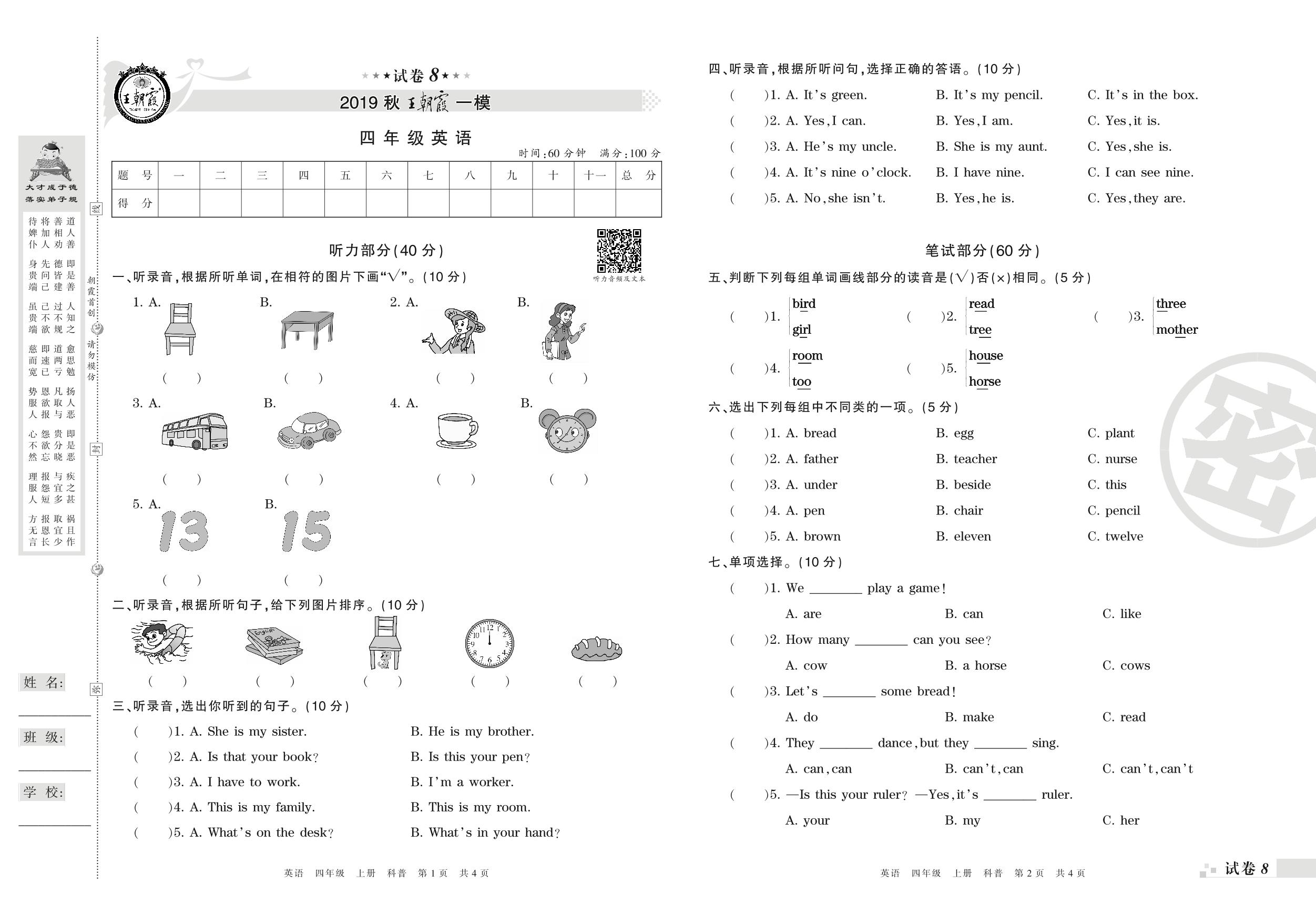 王朝霞期末模拟卷四年级上册英语(科普版)_R21080793815【8】