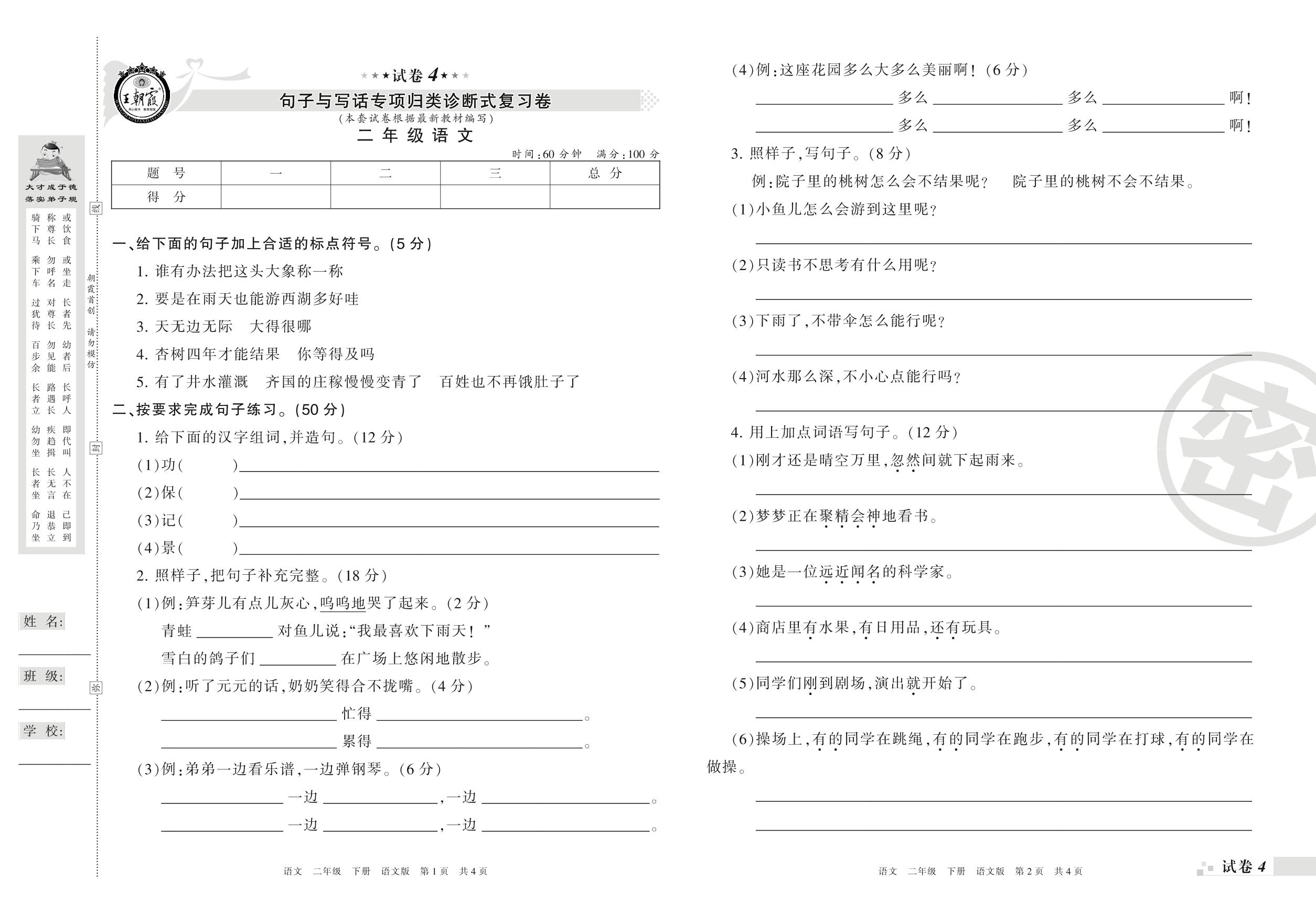 王朝霞期末专项卷——句子与写话专项归类诊断式复习卷二年级下册语文(语文版)_R21080181317【4】