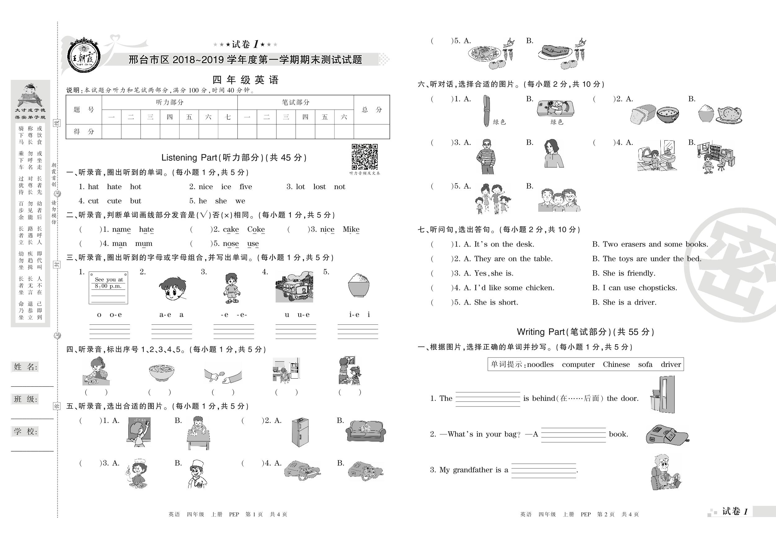 2018-2019学年第一学期邢台市区四年级英语试卷(PEP版)【1】