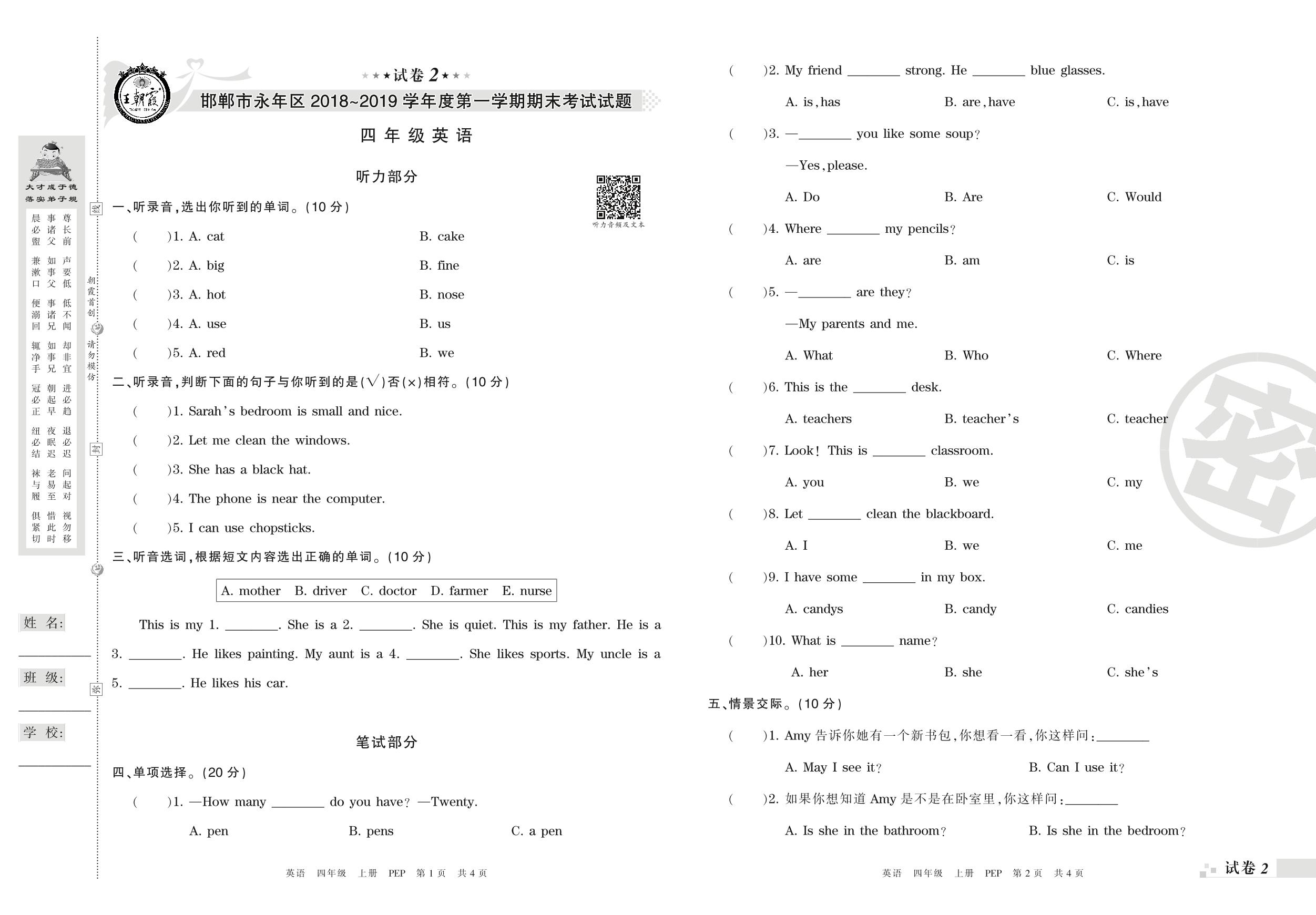 2018-2019学年第一学期邯郸市永年区四年级英语试卷(PEP版)【2】