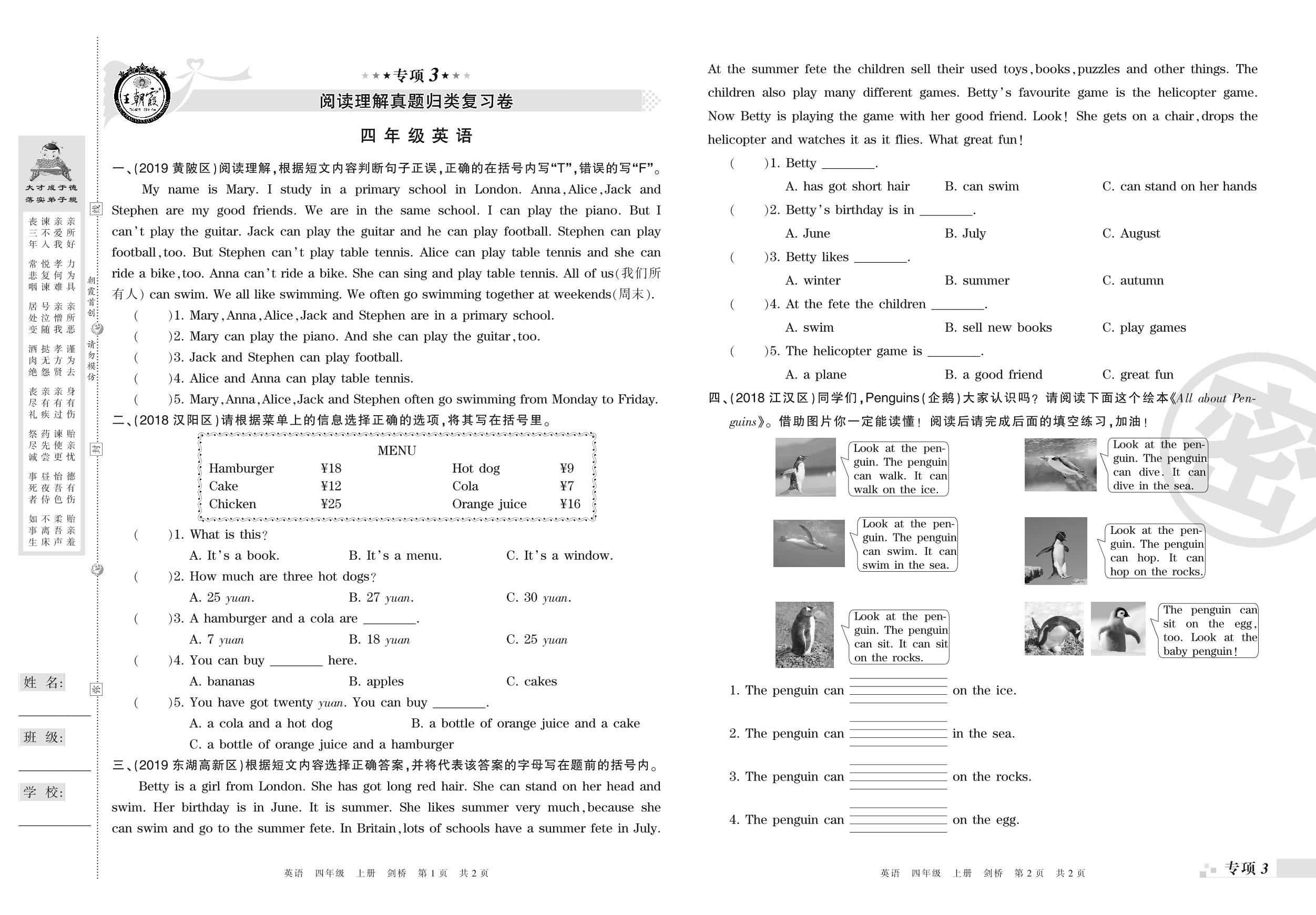 王朝霞期末专项卷——阅读理解、情景交际与写作真题归类复习四年级上册英语(剑桥版)_R21080793936【0】