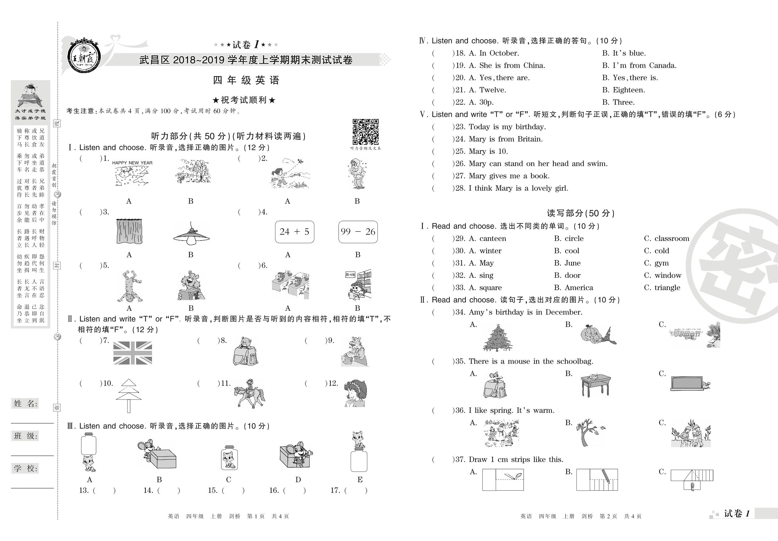 2018-2019学年第一学期武汉市武昌区四年级英语试卷(剑桥版)【1】