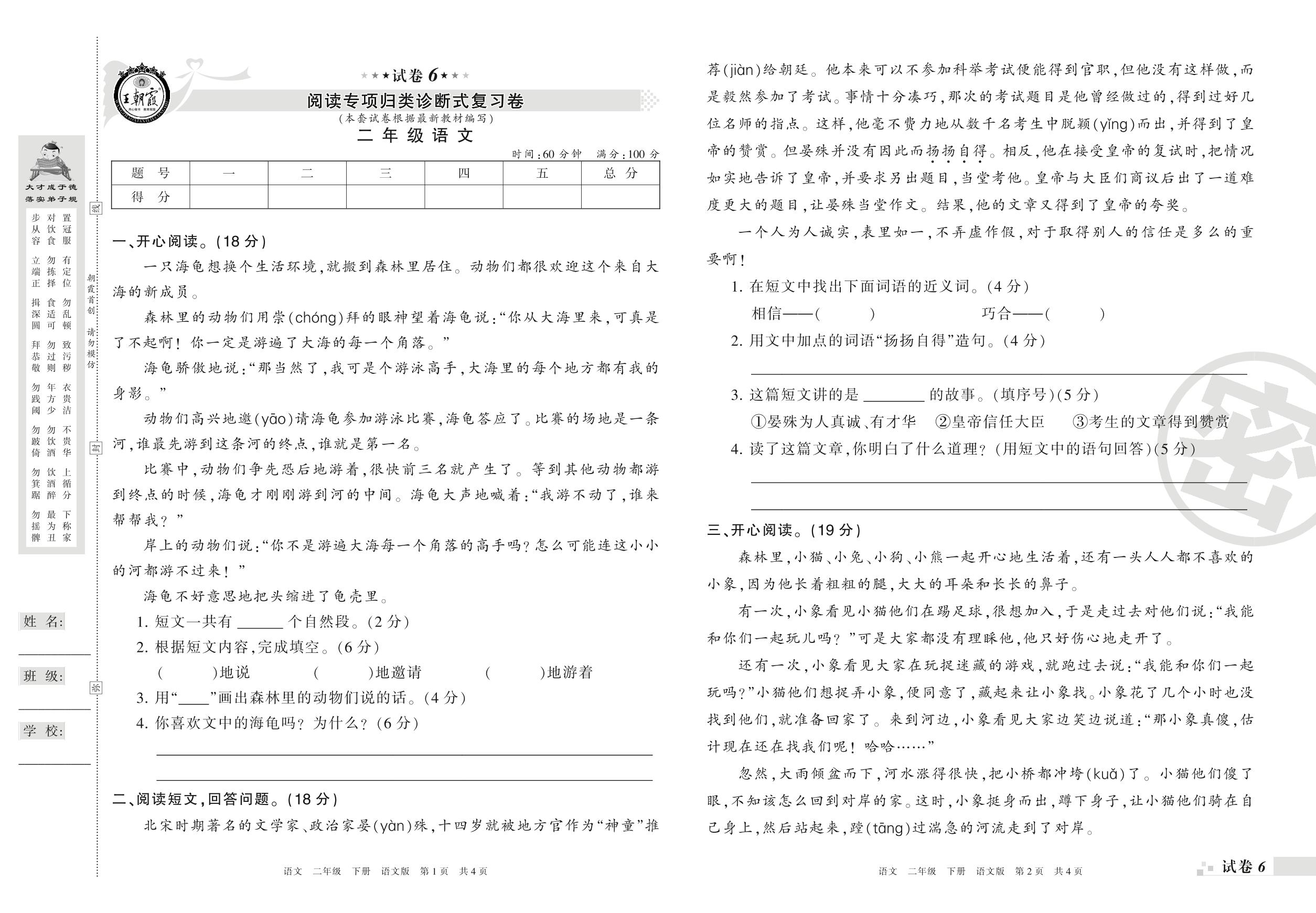 王朝霞期末专项卷——阅读专项归类诊断式复习卷二年级下册语文(语文版)【6】