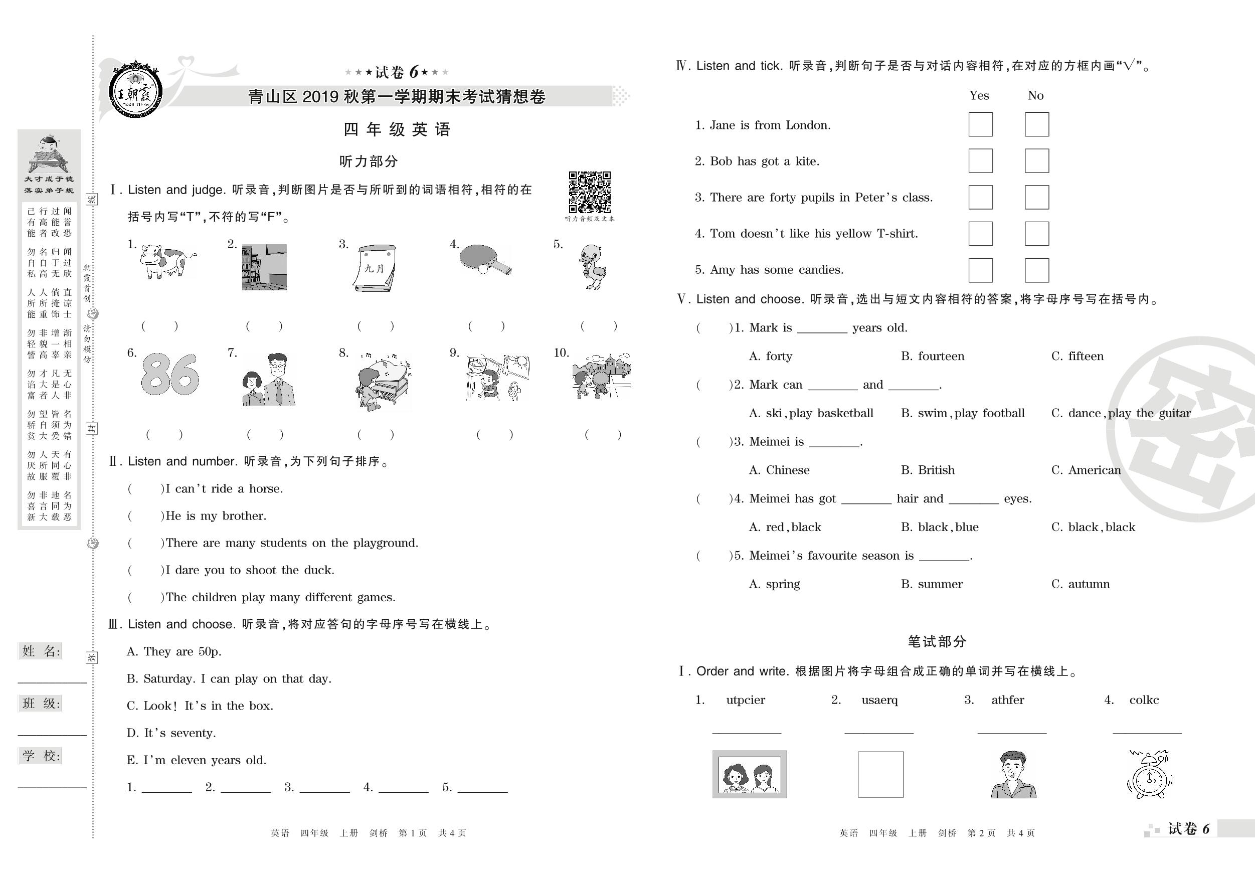 2018-2019学年第一学期武汉市青山区四年级英语试卷(剑桥版)【6】